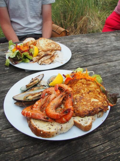 La spécialité de Kaikoura, ce sont les langoustes, mais on peut aussi y manger d’autres poissons et fruits de mer frais de la pêche du jour. Le cadre est sympa puisque ce petit stand de BBQ se trouve près de la plage, dans un cadre bucolique et sans prétention. On s’installe à de grandes tables en plastique pour déguster son assiette à peine sortie du barbecue au milieu des autres touristes et locaux. Ce ne fut pas notre meilleur repas mais c’est l’un des endroits les moins chers pour manger des langoustes sur l’île du Sud.