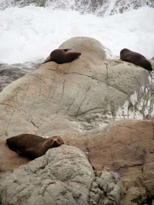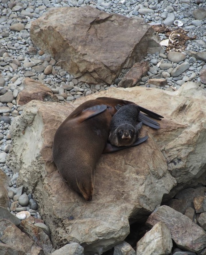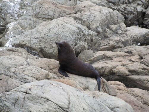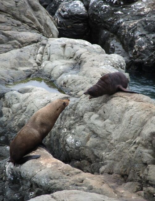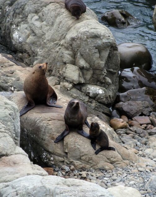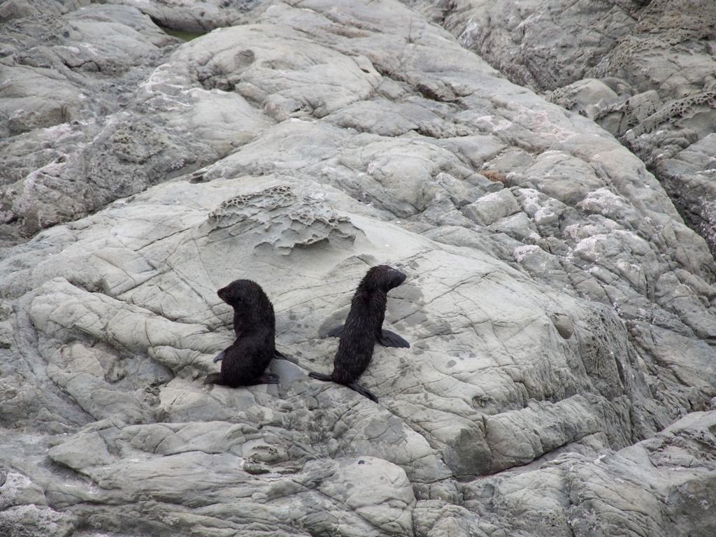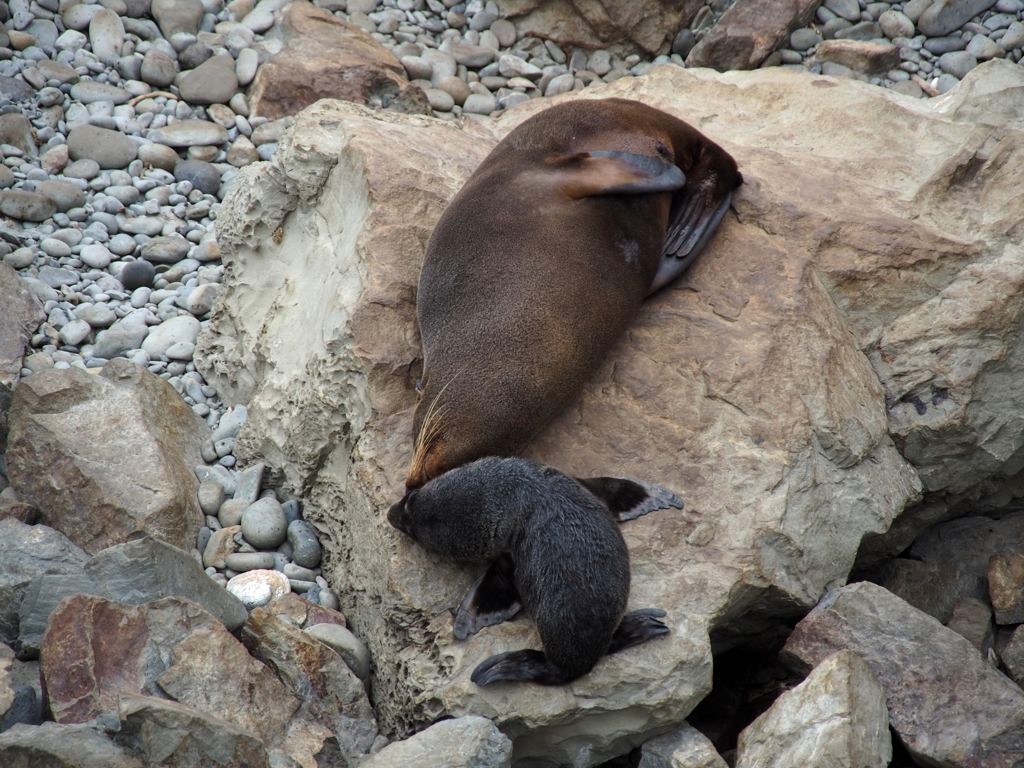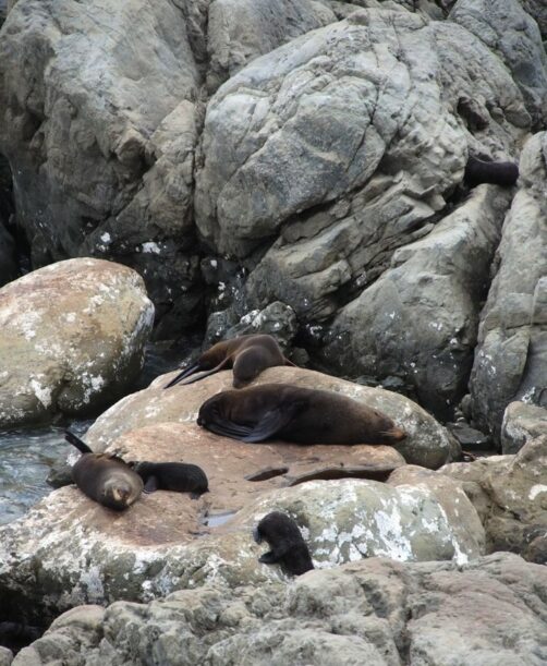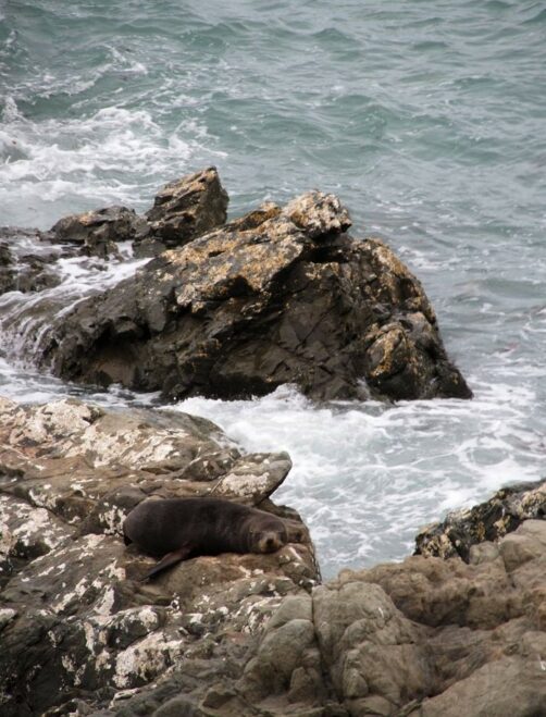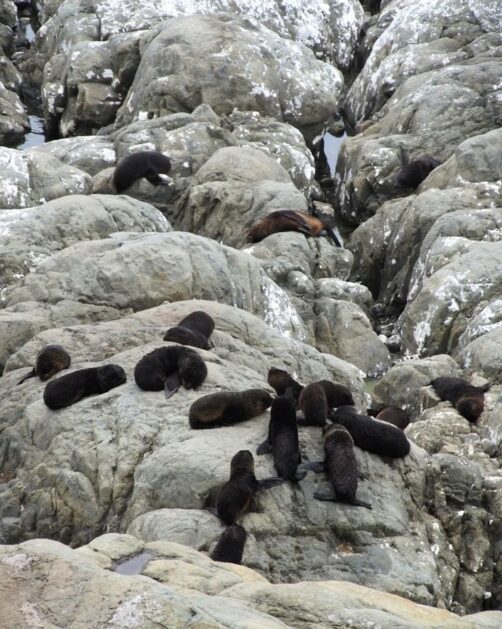 Nous n’avions pas encore fini de pousser des « oh! » d’exclamation ce jour-là : entre Kaikoura et Blenheim, juste le long de la route côtière qui longe l’Océan Pacifique, on peut observer facilement une grande colonie d’otaries à fourrure, la Ohau Point Seal Colony. Nous sommes restés très longtemps à les observer. Il y avait plein de bébés, c’était génial !
