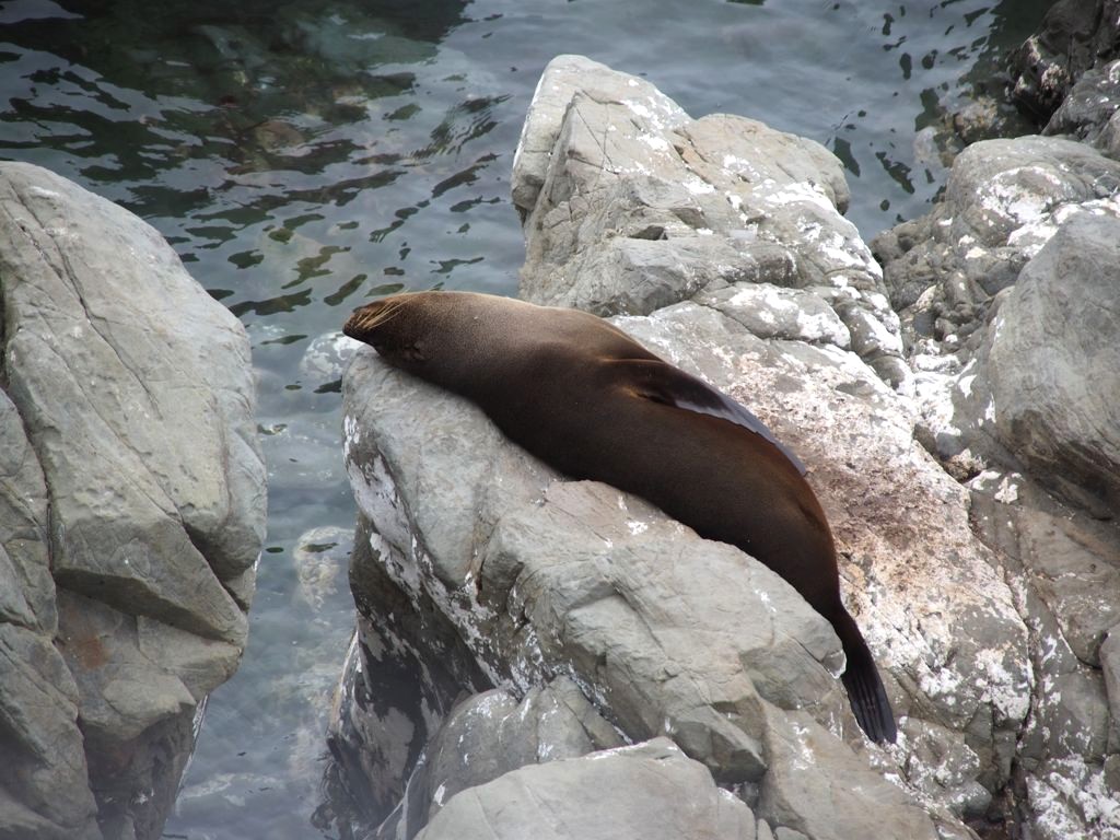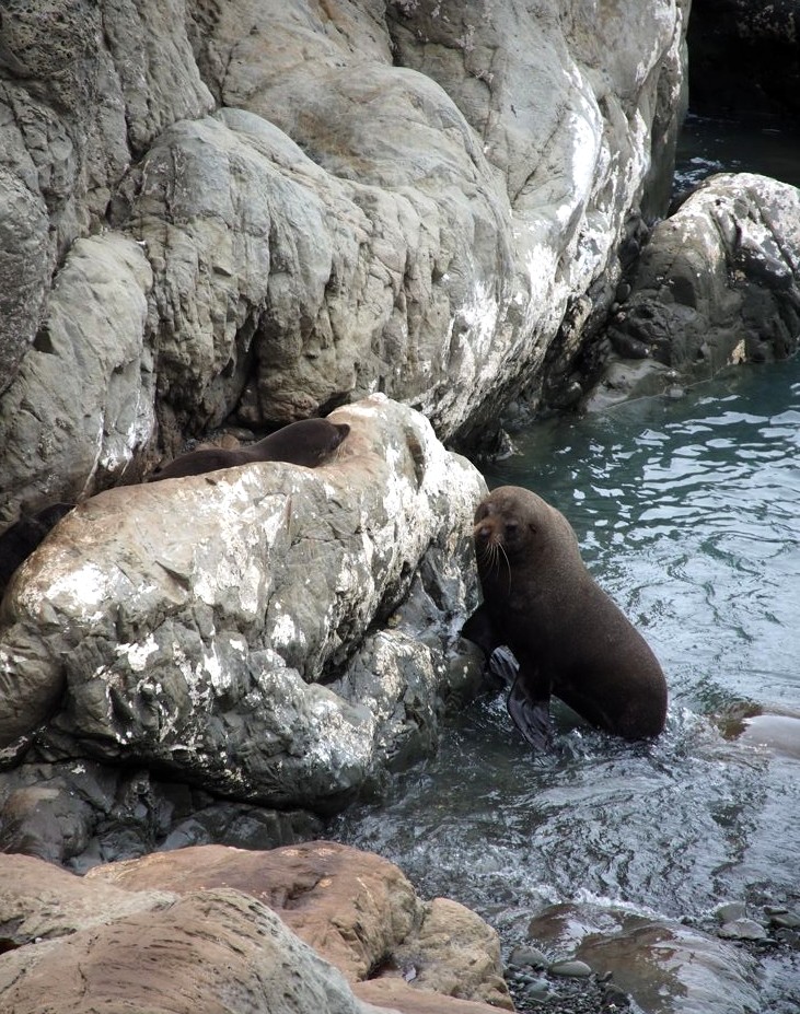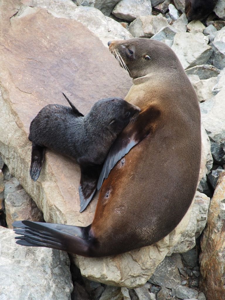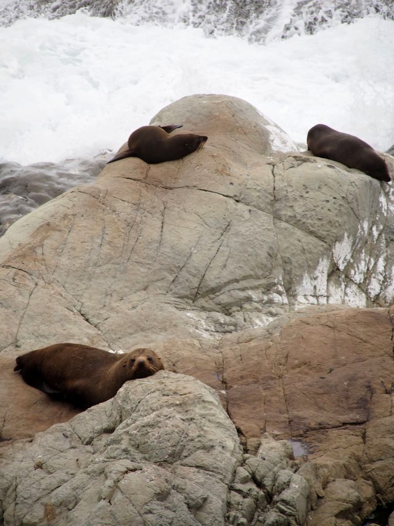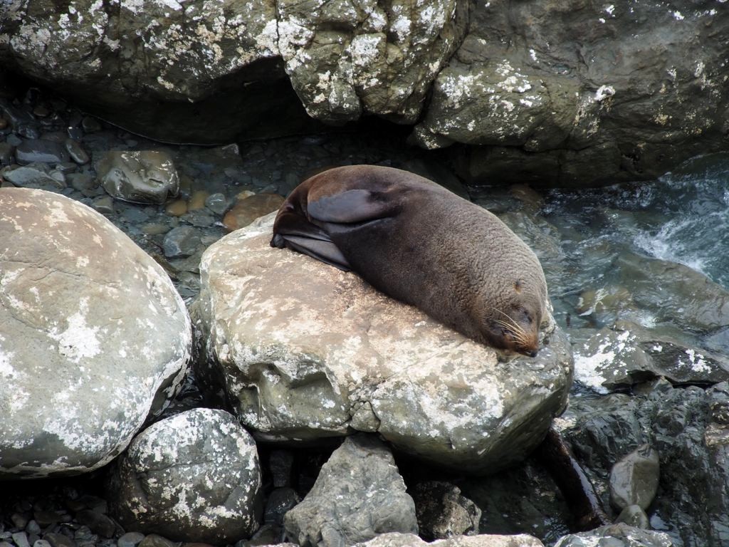 Nous n’avions pas encore fini de pousser des « oh! » d’exclamation ce jour-là : entre Kaikoura et Blenheim, juste le long de la route côtière qui longe l’Océan Pacifique, on peut observer facilement une grande colonie d’otaries à fourrure, la Ohau Point Seal Colony. Nous sommes restés très longtemps à les observer. Il y avait plein de bébés, c’était génial !