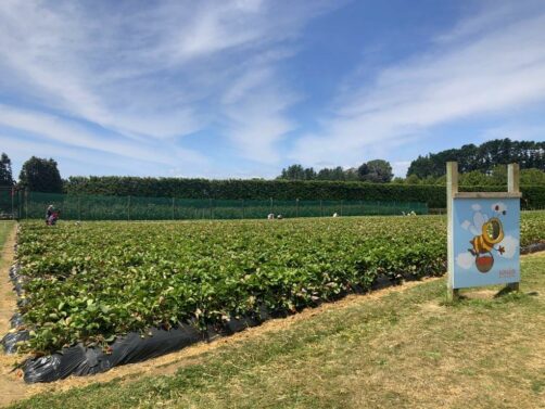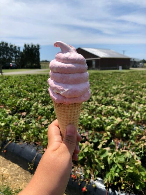 A quelques kilomètres du centre-ville se trouve aussi l’un des plus chouettes endroits qu’on a vu pour manger une real fruit ice cream (pour rappel, notre truc préféré en Nouvelle-Zélande !) : Paradise Valley Berry Farm. Comme nous étions en pleine saison des fraises et des fruits rouges, la ferme proposait de récolter soi-même des fruits dans les champs !