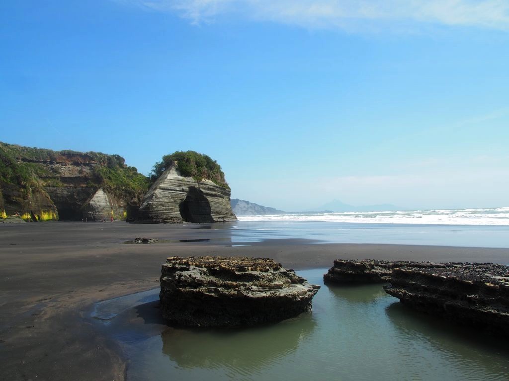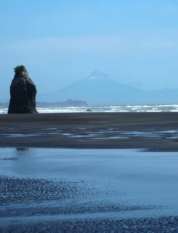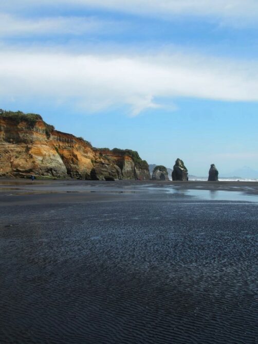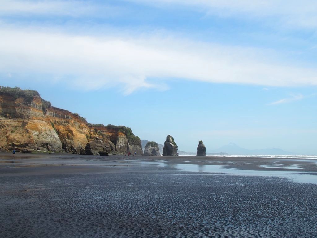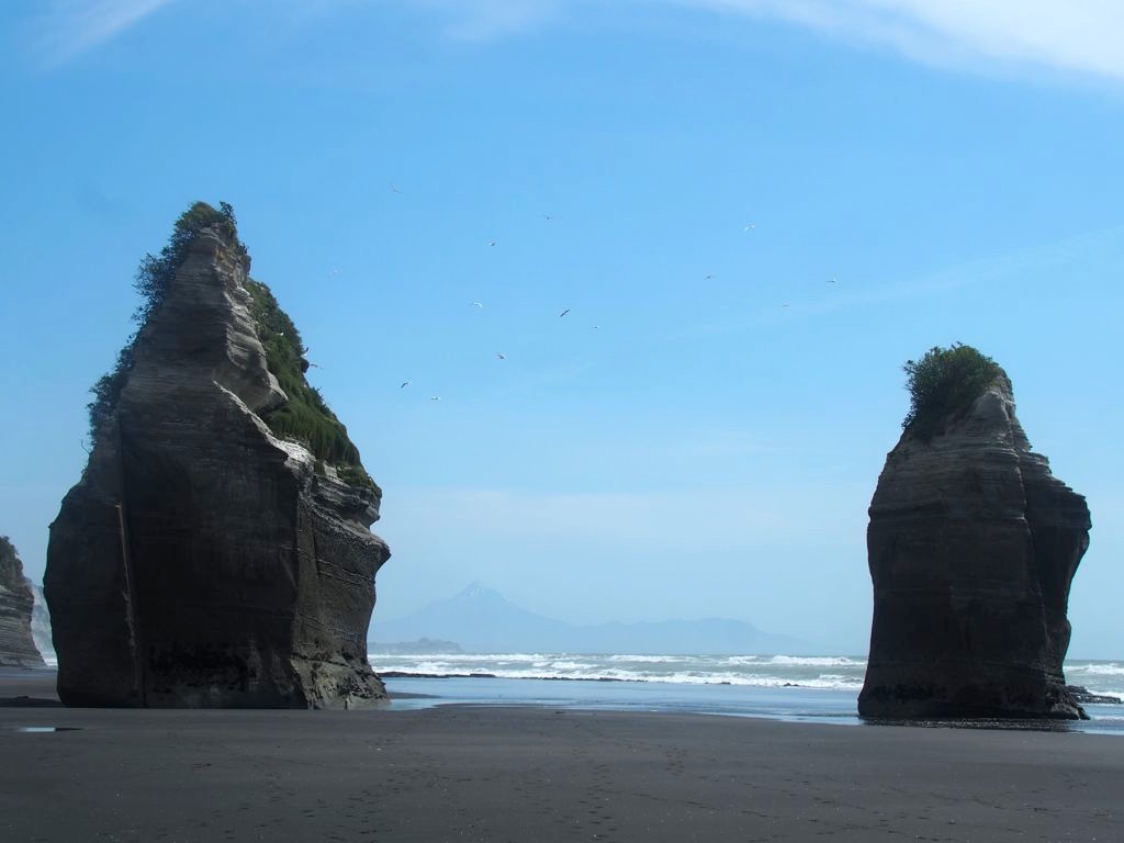 La plage volcanique de sable noire est notamment connue pour ses rochers surnommés les « Three Sisters » (les 3 soeurs… dont il n’en reste plus que 2 !) et « Elephant Rock » (rocher précédemment en forme d’éléphant, mais ce n’est plus le cas non plus depuis quelques années). La balade sur cette plage gigantesque était vraiment agréable, et on peut aussi voir au loin le Mont Taranaki.