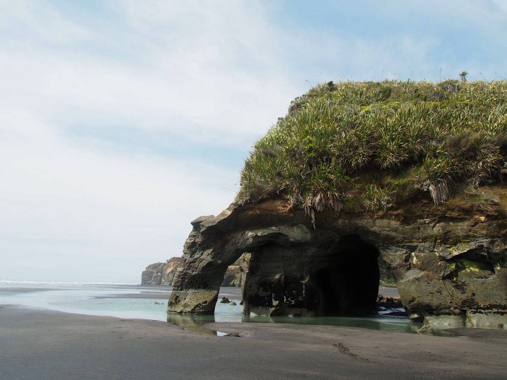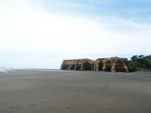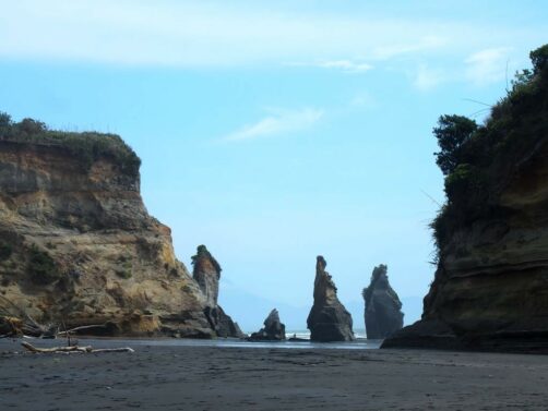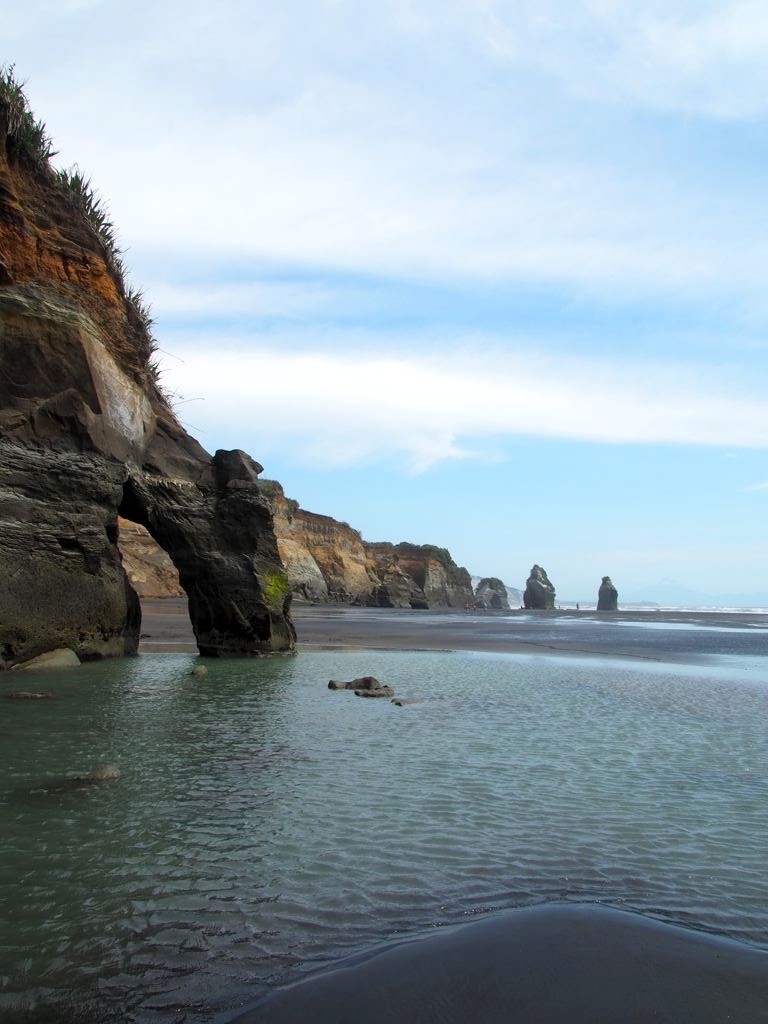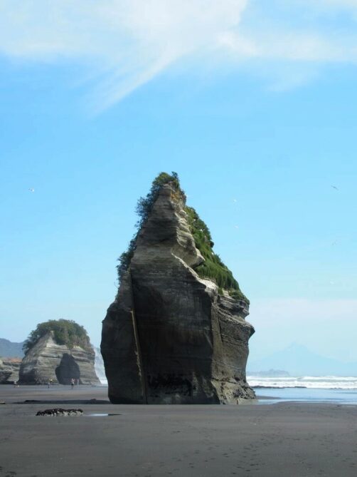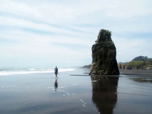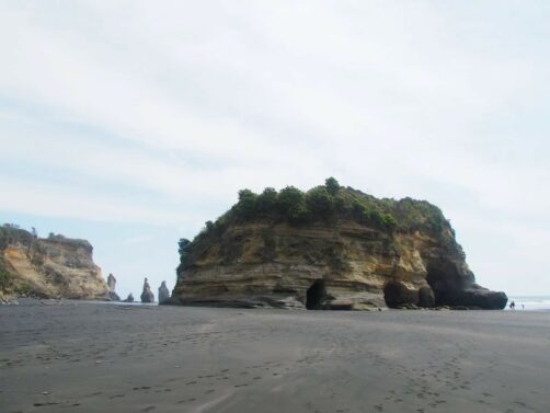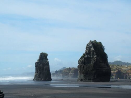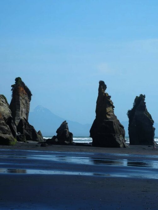 La plage volcanique de sable noire est notamment connue pour ses rochers surnommés les « Three Sisters » (les 3 soeurs… dont il n’en reste plus que 2 !) et « Elephant Rock » (rocher précédemment en forme d’éléphant, mais ce n’est plus le cas non plus depuis quelques années). La balade sur cette plage gigantesque était vraiment agréable, et on peut aussi voir au loin le Mont Taranaki.