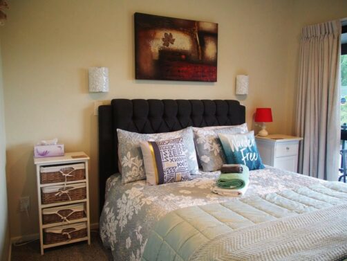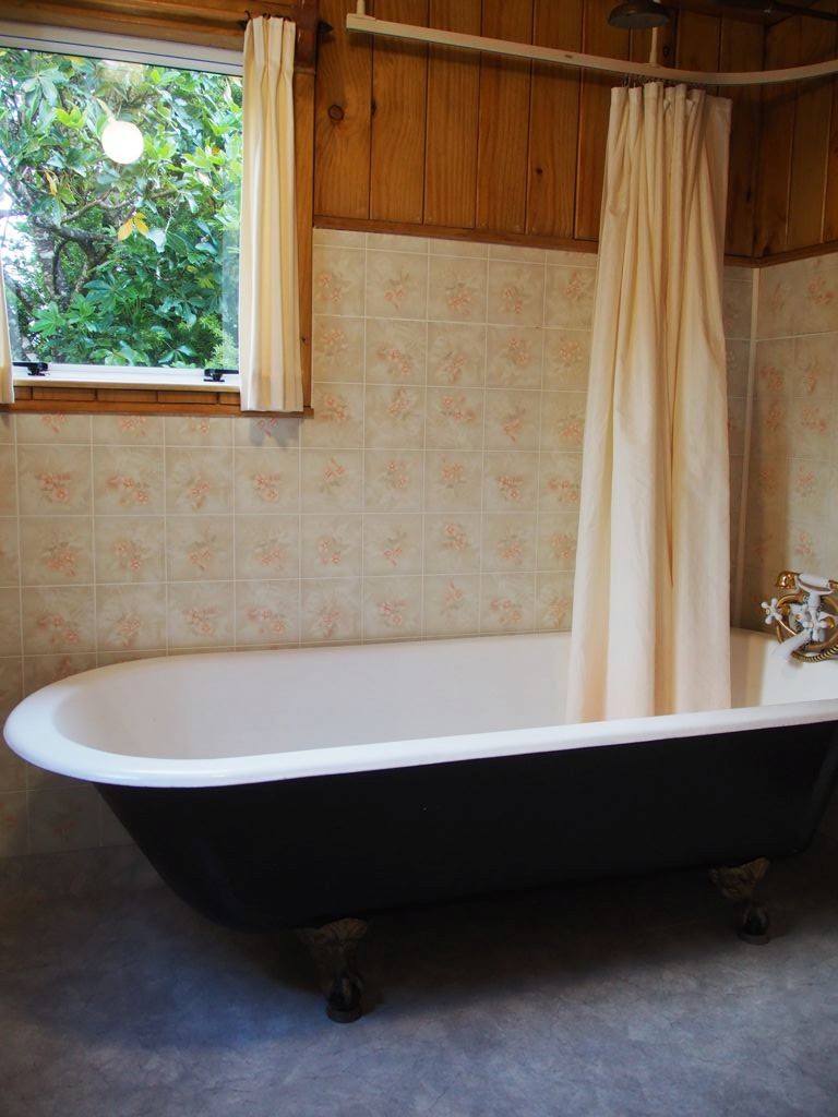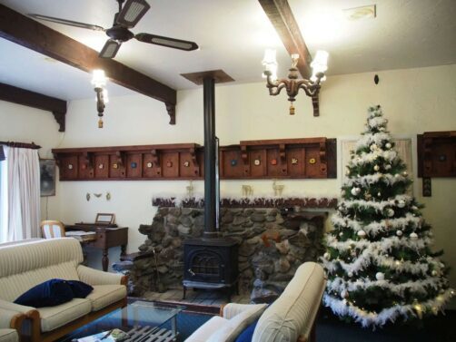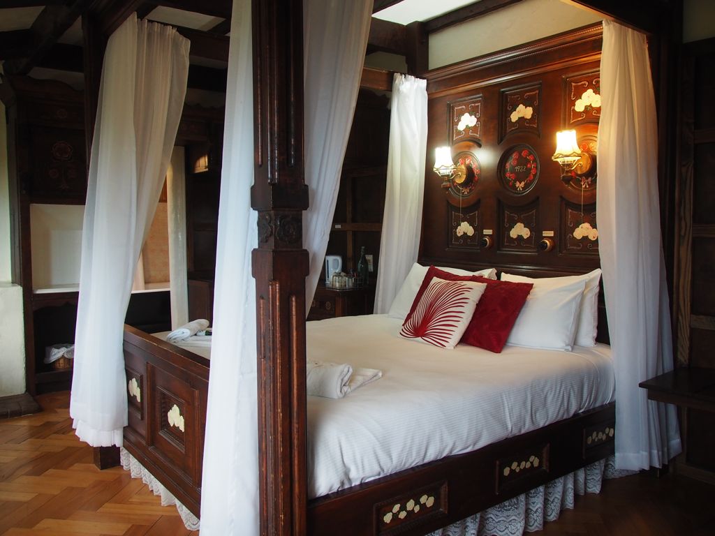 Cette lodge historique de style montagnard un peu kitsch (j’adore !) est ouverte de manière saisonnière et est située juste à côté du visitor center. Certaines chambres ont une vue directe sur le Mont Taranaki (quand il veut bien se montrer !), mais j’avais préféré craquer pour leur « suite lune de miel », à la déco super sympa.