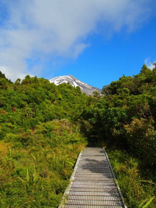 Etant en fin de voyage et un peu fatigués après 5 semaines intensives, nous avons donc finalement choisi d’explorer une destination qui était plus ou moins sur notre chemin et qui parlait aussi à l’amoureuse de volcans que je suis : le splendide Mont Taranaki. Et je ne regrette pas le moins du monde mon choix : nous avons fini ce voyage en beauté, avec des promenades accessibles à tous dans un cadre incroyable.