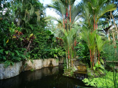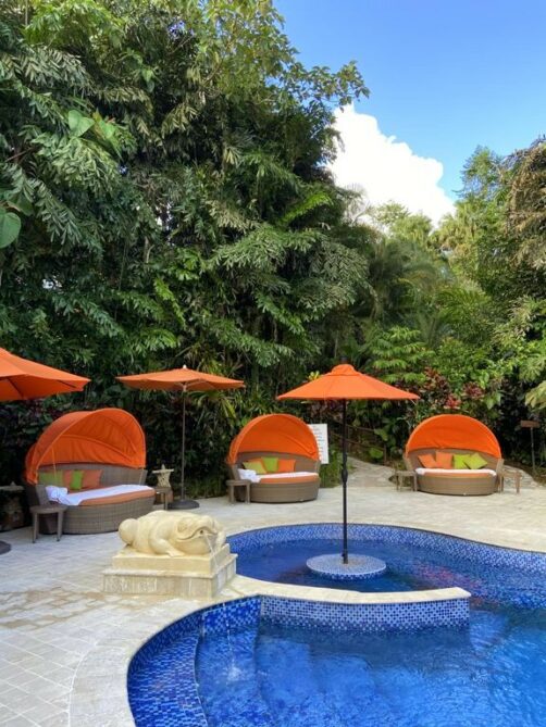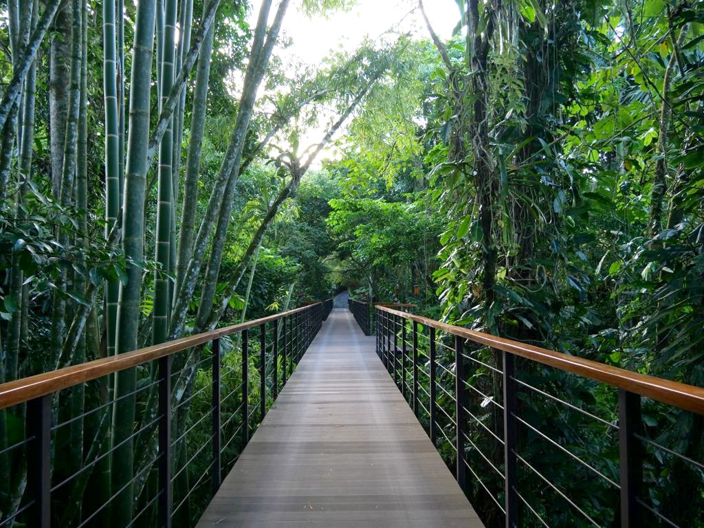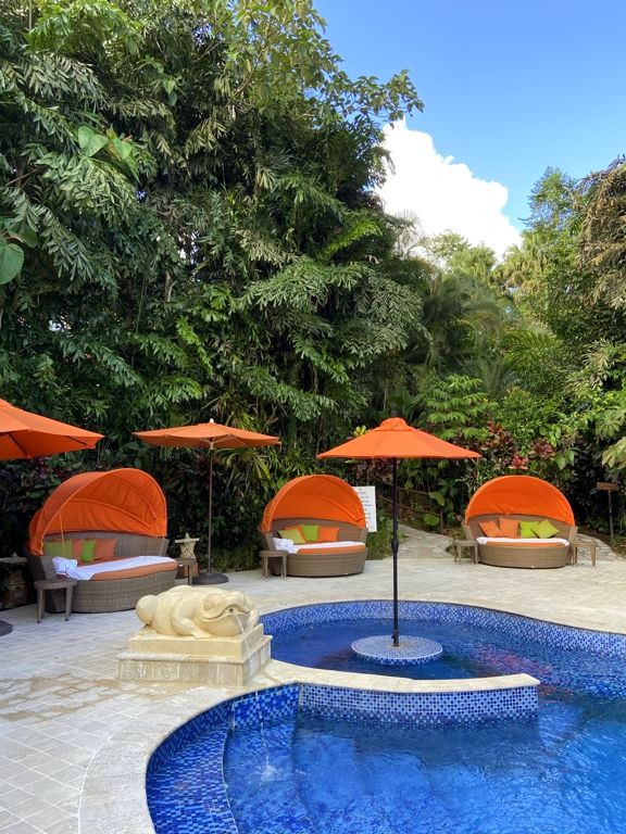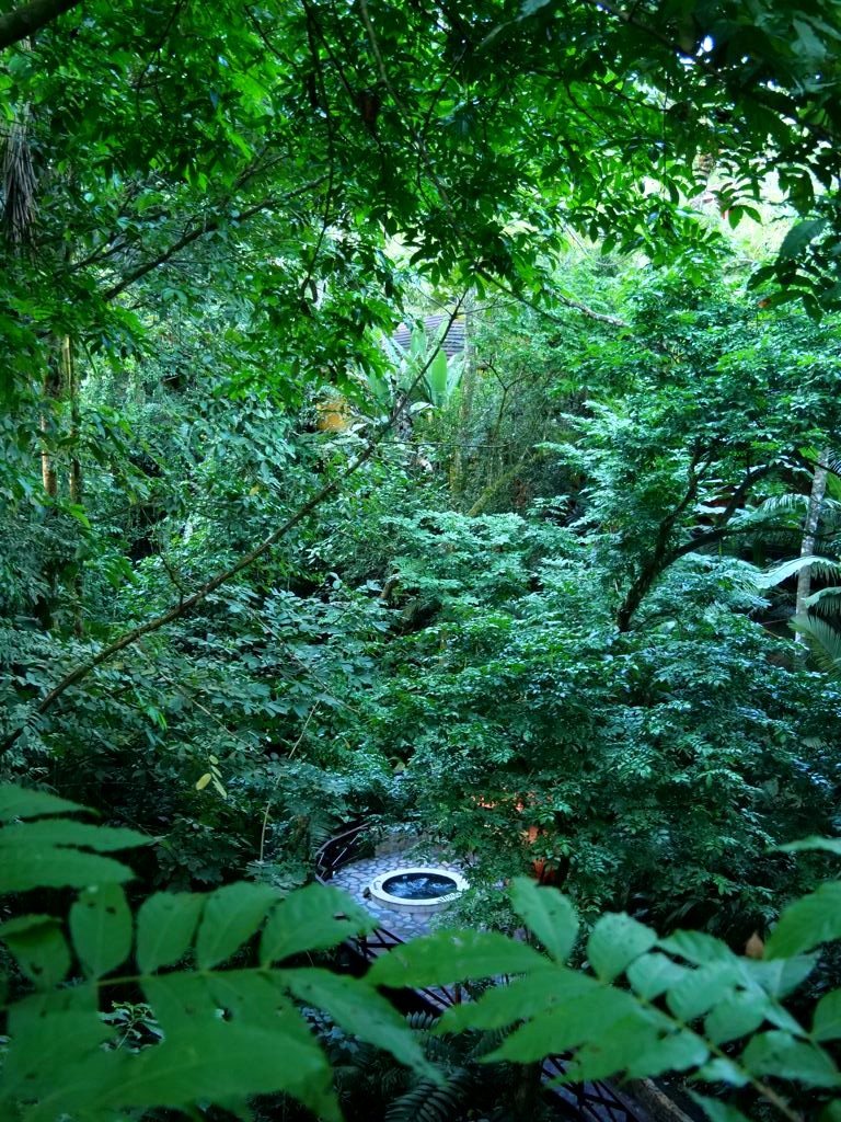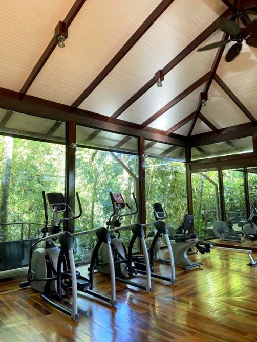 Il y a notamment plusieurs grandes piscines (dont une avec des tables dans la piscine pour prendre l’apéro les pieds dans l’eau !), plein de petits jacuzzis cachés un peu partout (je ne suis même pas certaine de les avoir tous repérés !), un spa où on peut réserver des massages (pas testé), une salle de sport totalement dingue avec vue sur la forêt tropicale, et même quelques trails pour se balader dans la forêt !