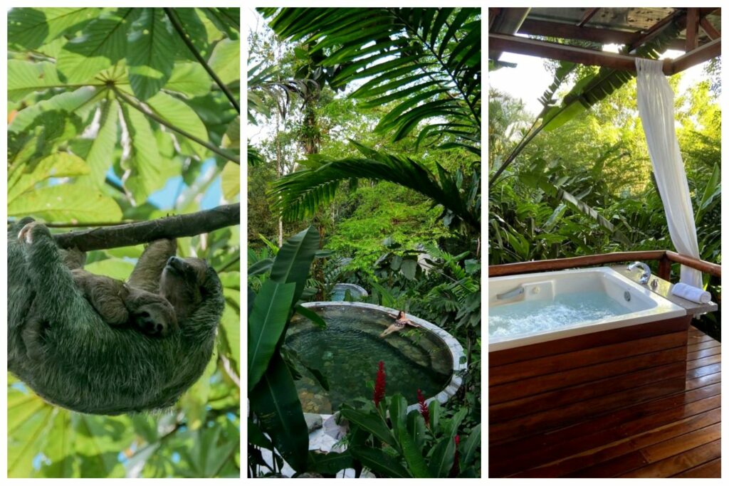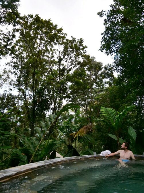 Nous avons pu en profiter durant de longues heures en les ayant littéralement pour nous tous seuls (le Covid a tout de même eu quelques avantages)… Le personnel vraiment incroyable nous a même spotté un paresseux dès notre arrivée, et on a pu l’observer longuement, tout en barbotant dans de l’eau à la température parfaite. Je n’aurais pas pu rêver mieux pour ma première observation de paresseux du voyage ! Observer un paresseux depuis un bassin thermal dans la jungle, c’est clairement la « pura vida » !
