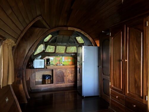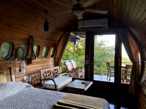 L’avion dans lequel nous avons séjourné est le Cockpit Cottage, un ancien cockpit d’avion transformé en une chambre tout confort, avec intérieur climatisé décoré tout en bois et teck, salle de bain extérieure, terrasse avec vue sur la mer et le parc Manuel Antonio… Et le tout, entouré par les animaux sauvages, en particulier des singes (je vous ai dit que j’adore les singes ?) !
