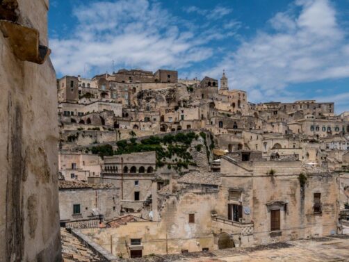 Lovée presque sur le creux du pied de la botte italienne dans le Basilicate, Matera est une des plus anciennes villes d’Italie, voire du monde. Au bord d’un canyon creusé par la rivière Gravina, les Humains ont tiré parti de cette configuration pour y creuser leurs habitations dans la roche et ainsi naquit Matera. Maisons, magasins, églises, réservoirs d’eau… la partie la plus ancienne de la ville est troglodyte. On les appelle les « Sassi », les cailloux. Jusqu’en 1952, les habitants y vivaient jusqu’à ce que le gouvernement italien, horrifié par les conditions de vie (certes difficiles) de ces « hommes des cavernes » n’obligea à évacuer les Sassi. C’était alors « la honte de l’Italie ».