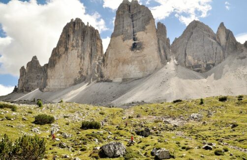 Ces trois dents sont le symbole des montagnes dolomitiques. Cette région du Sud Tyrol est en Italie, mais l’Autriche voisine est omniprésente. En exagérant, il est plus facile d’y trouver de l’apfelstrudel qu’un tiramisu ! Aux portes de Cortina d’Ampezzo se situe Misurina, avec son lac du même nom et ses montagnes si caractéristiques. Une route (payante) permet de s’approcher du site des 3 cime. Un chemin permet de faire le tour en 3h de randonnée où on peut les admirer sous toutes les coutures ! Haut lieu de l’escalade mondial, en scrutant les faces, vous verrez peut être des petits points en train de grimper… Ces parois peuvent être extrêmement difficiles avec une grande partie déversante. La roche jaune est déversante, car l’eau ne s’y écoule pas (sinon ce serait noir). Ce site invite à la contemplation et à laisser voguer son imaginaire sur les exploits passés ou en cours.