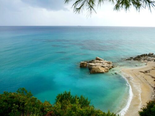 Les autres plages de la péninsule à découvrir : la Banana Beach, très fréquentée l’été pour son sable doré et ses sports nautiques, et la plage de Kalamari à l’est.