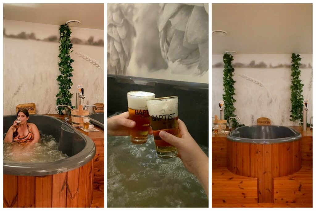 Et puisque c’est la question qu’on se pose sans doute tous avant de tester pour la première fois un spa à la bière : non, le bain ne sent pas du tout la bière ! Il n’y a que 2 litres de véritable bière dans le bain, accompagné du mélange houblon, malt et levure, ce qui donne même une odeur plutôt agréable. Il est recommandé de ne pas se laver tout de suite après la séance pour profiter de tous les bienfaits pour la peau. Et je dois dire en effet que notre peau était toute douce.