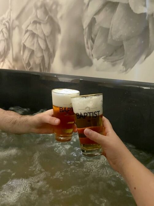 Pour le bain de bière, le Good Beer Spa a utilisé des « ofuro », des bains d’origine japonaise. Chaque bain peut être occupé par une ou deux personnes. Nous avions une formule 1 bain/deux personnes à 115€ la session et nous n’avons pas du tout manqué de place, malgré la taille de Monsieur (le bain fait 1,90m de long et 1m de large). Vous pouvez donc sans problème profiter du bain à deux, ce que je trouve même plus convivial.