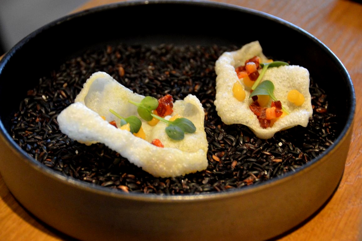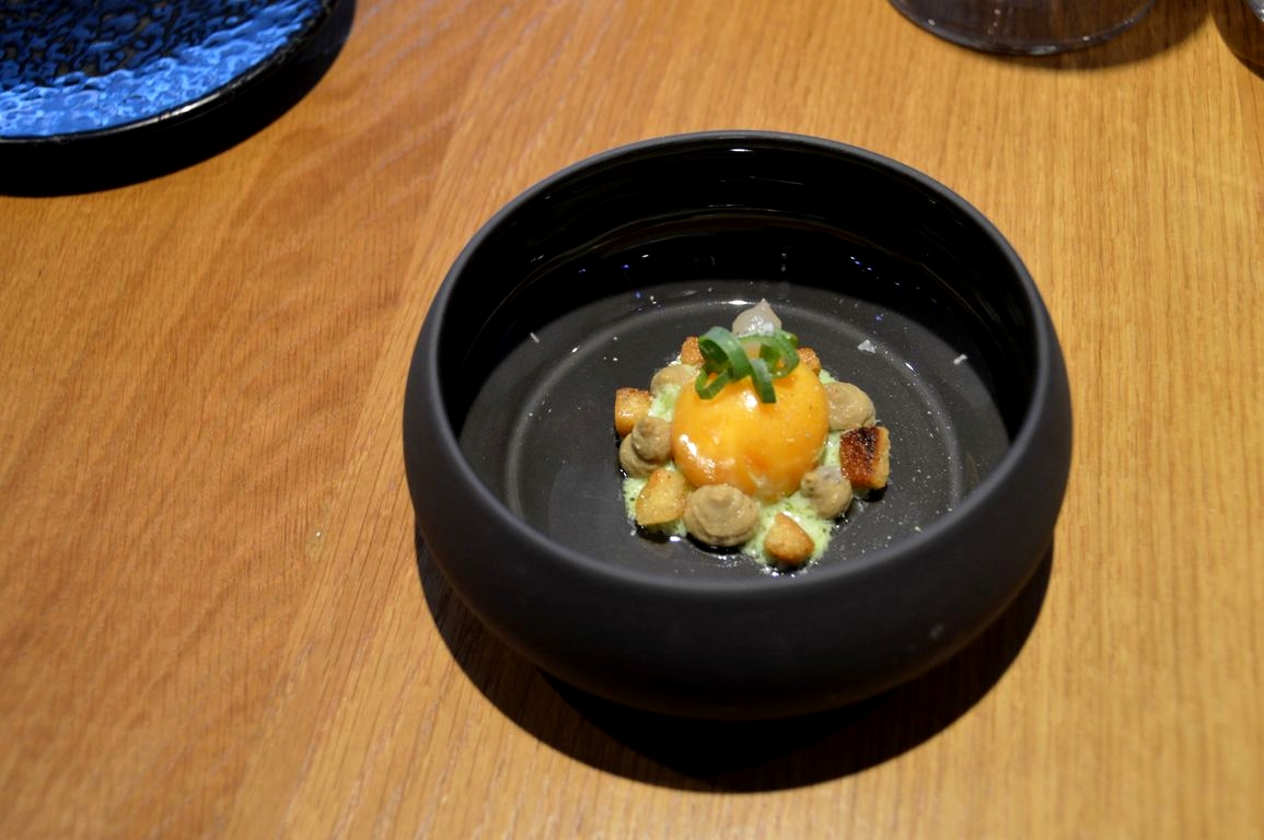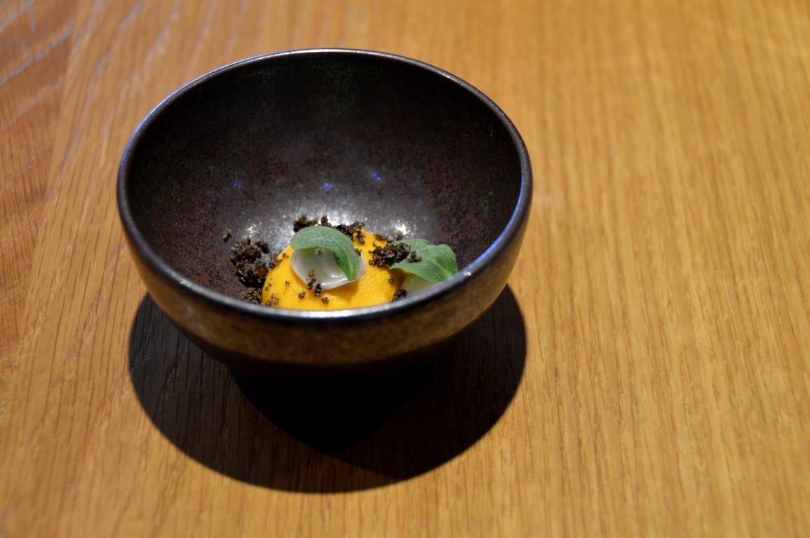 Nous commençons par trois petites mises en bouche, un petit chips, une préparation à base de carotte, crème d’anchois et terreau d’olives, et une autre à base de jaune d’oeuf cuit par le froid, crème de champignon et garam masala. Carl nous gardait le meilleur pour la fin, car c’est vraiment sur cette dernière préparation que nous avons craqué !