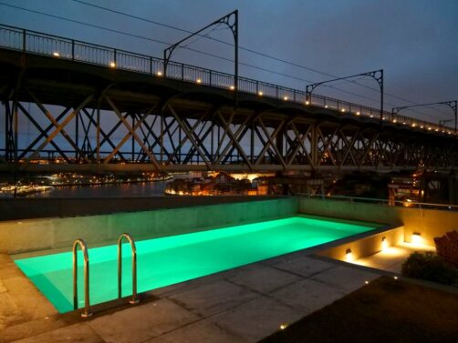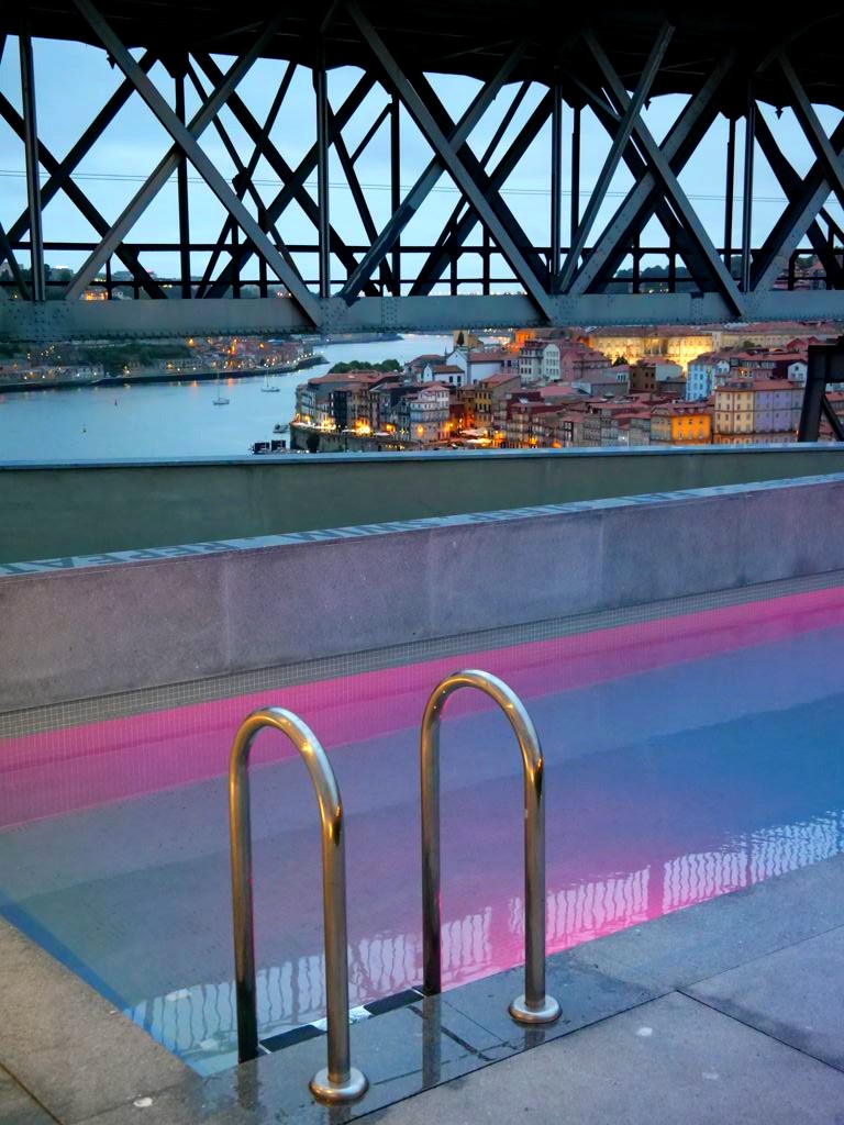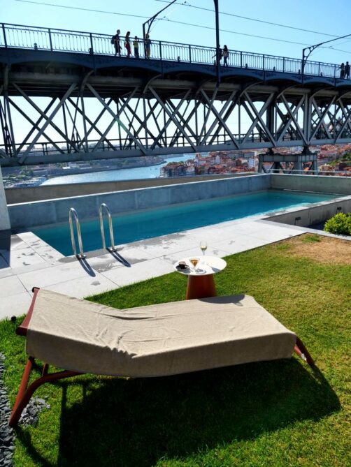 Les autres parties communes ont été dispersées dans les étages intermédiaires de l’hôtel : restaurants, bar à vin, salle de fitness, et surtout l’autre cerise sur le gâteau de l’hôtel : son Sky Bar agrémenté d’une petite piscine avec vue. Quelques transats et de gros fauteuils permettent de profiter d’une vue imprenable sur Porto, en profitant d’un petit verre (un verre d’accueil est d’ailleurs offert pour les clients de l’hôtel !).