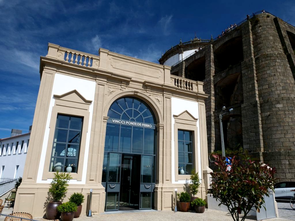 Cette entrée principale (la seule accessible sans sa carte de chambre) se situe au niveau du haut du pont. Mais il est aussi possible de rentrer par le bas de l’hôtel situé quasiment au niveau inférieur du pont (après une petite montée). En empruntant les ascenseurs de l’hôtel, on a donc facilement accès aux deux niveaux du pont, accessible aux piétons, qui permettent de traverser facilement vers le haut et le bas du centre historique de Porto.