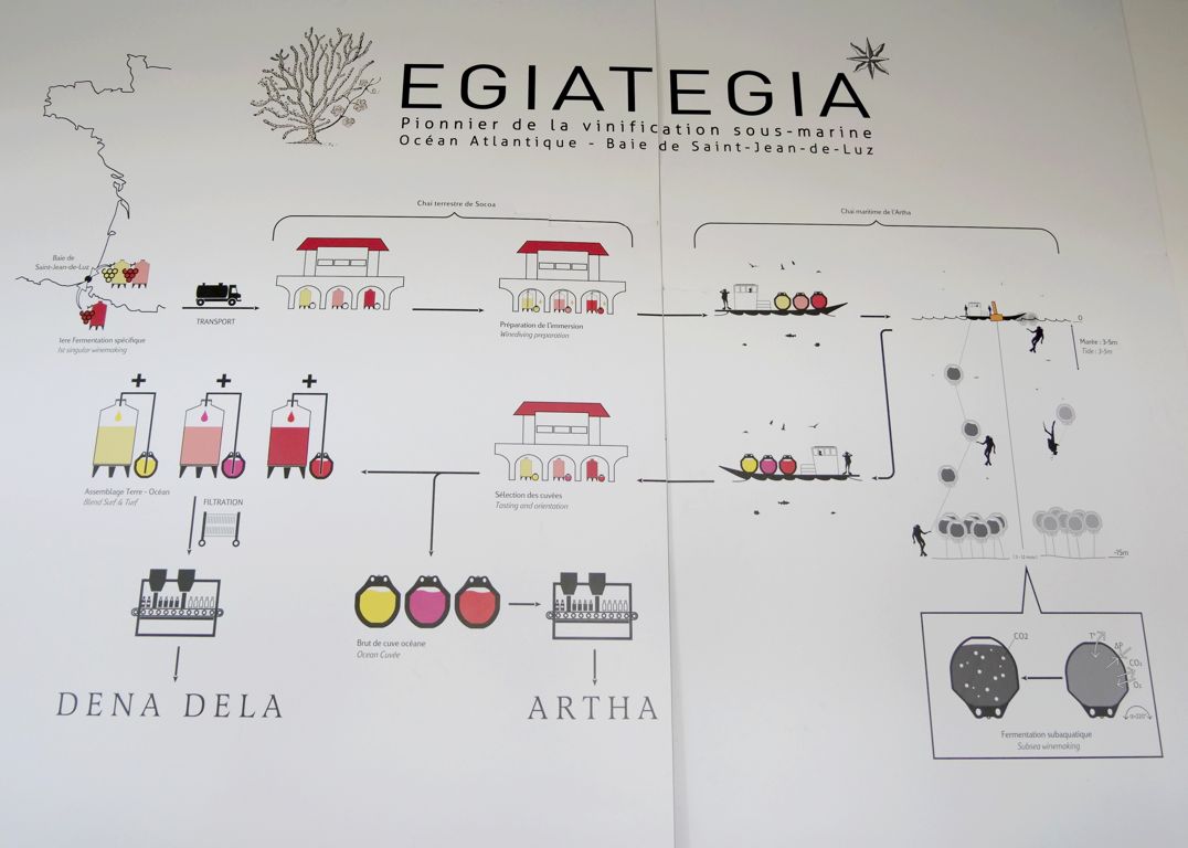 On trouve chez Egiategia à Ciboure, face à Saint-Jean-de-Luz, des vins très particuliers puisque cette entreprise unique en France (et au monde) est spécialisée dans la vinification sous-marine ! Les cuvées sont immergées dans l’eau de mer, à 15 mètres de profondeur au large de la baie de Ciboure et Saint-Jean-de-Luz. La houle et la pression de l’eau vont totalement transformer les vins, comme on peut s’en rendre compte en dégustant l’une après l’autre la cuvée Artha, vinifiée à 100% sous l’eau, et la cuvée Dena Dela, qui est un assemblage « terre et mer ». La différence est fulgurante : la vinification sous l’eau révèle des notes vraiment étonnantes. À découvrir lors d’une visite-dégustation (uniquement sur réservation).