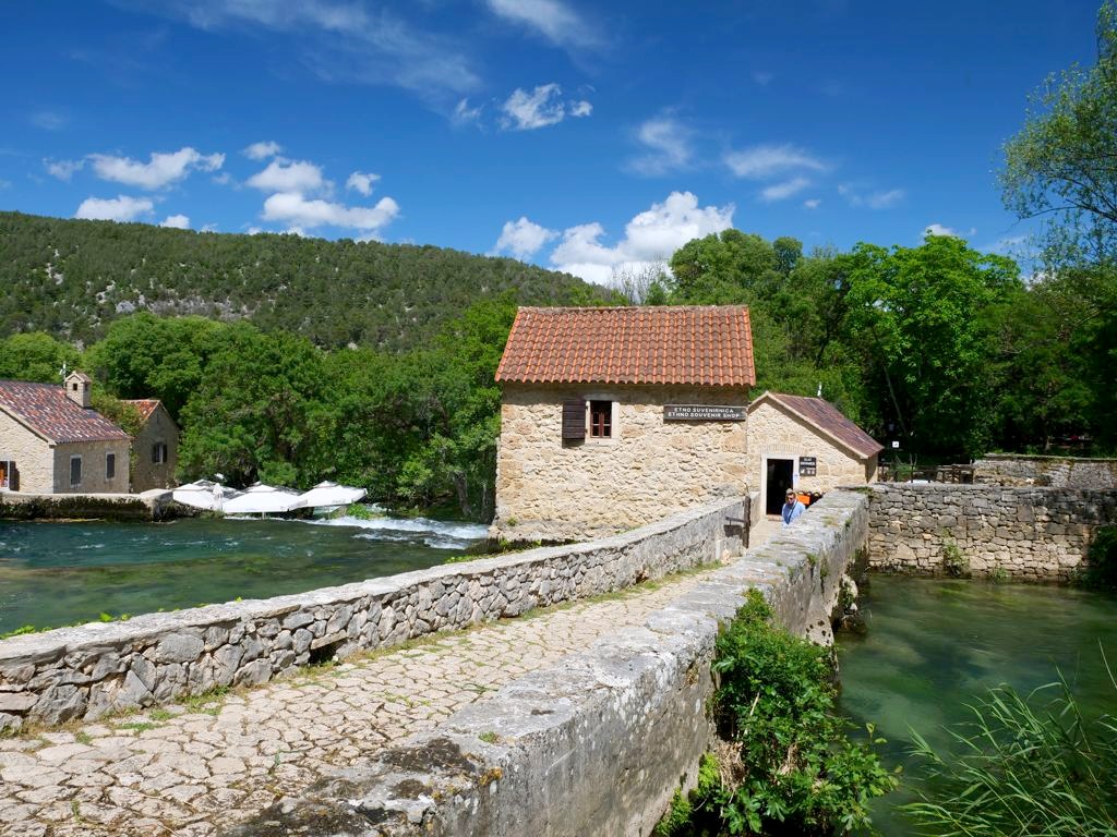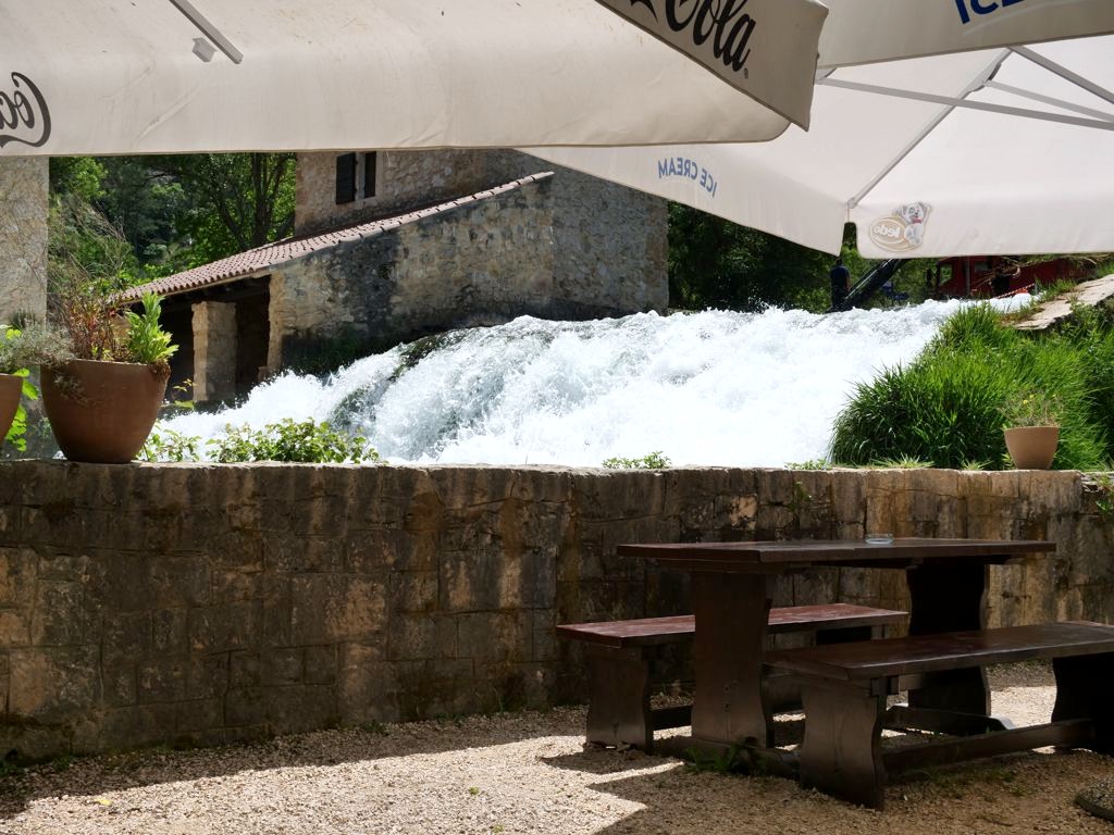 Notre dernier arrêt de la journée fut les chutes de Roski Slap. Attention, il vous faudra remontrer ici votre ticket d’entrée du parc, donc ne le perdez pas ! Nous avons commencé par aller faire un tour au moulin, où se trouve aussi un petit restaurant. Depuis les pontons, on peut déjà apercevoir les chutes d’eau. C’est encore plus calme ici, et vraiment joli !