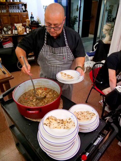 - et enfin LA spécialité de Yecla : le gazpacho yeclano. Celui-ci n’a rien à voir avec le gaspacho andalou, qui est celui que l’on connaît tous. Il s’agit d’une variante du gaspacho de la Mancha, un plat en sauce très copieux servi avec des morceaux de « tortas de gazpacho », des galettes de froment. A Yecla, on le prépare traditionnellement avec du lapin et des escargots. Et à la fin du repas, on garde la galette qui a trempé dans le jus du plat pour la manger avec… des anchois et du miel ! Vous l’aurez compris, il s’agit d’une spécialité locale vraiment originale, qu’on aime ou qu’on déteste (personnellement, j’ai eu un peu de mal).