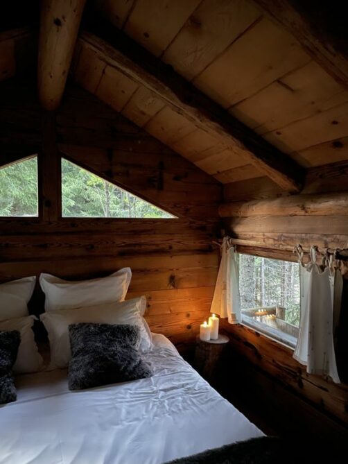 Les deux cabanes sont très cosy et chauffées au poêle au bois : en cette fin d’été, c’était parfait pour la nuit, et le lit était particulièrement confortable pour une cabane en bois !