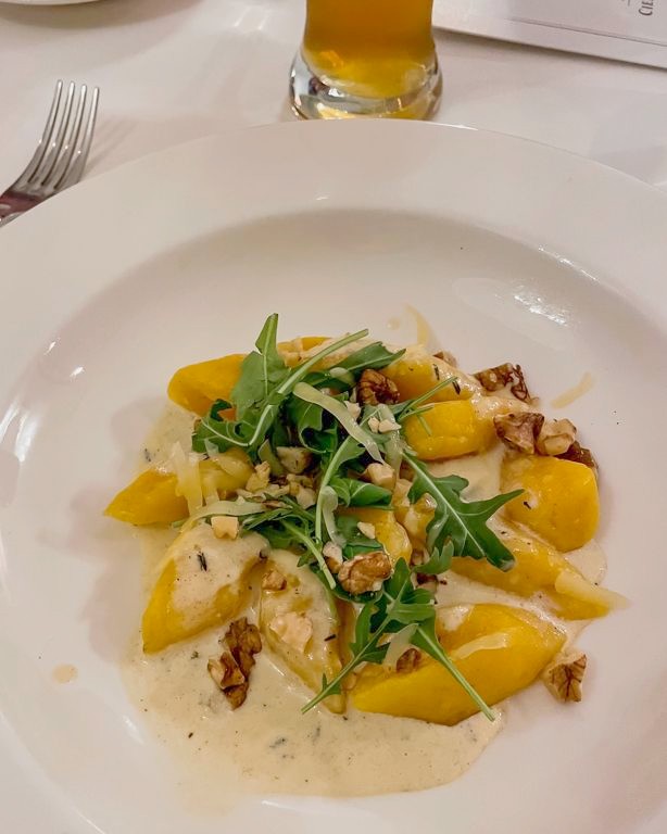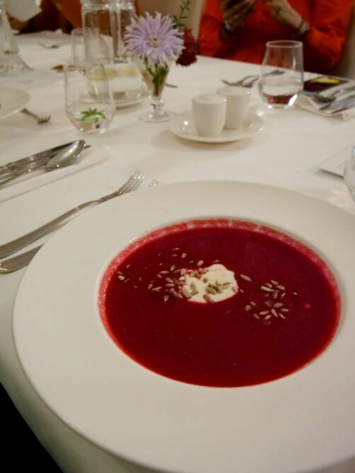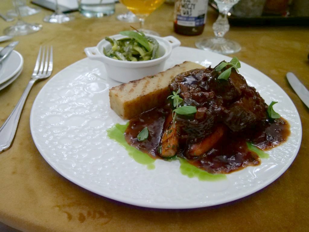 Après cet apéritif prolongé au bar, nous sommes passés côté restaurant pour y déguster ce qui a probablement été le meilleur repas de ce voyage (quand je vous disais que cet endroit était une pépite !). Soupe à la betterave, joues de boeuf, dumplings au potiron et « Charlotka », la tarte aux pommes typiquement polonaise : parfois, la simplicité a vraiment du bon et c’est quelque chose que la Pologne a vraiment bien compris !