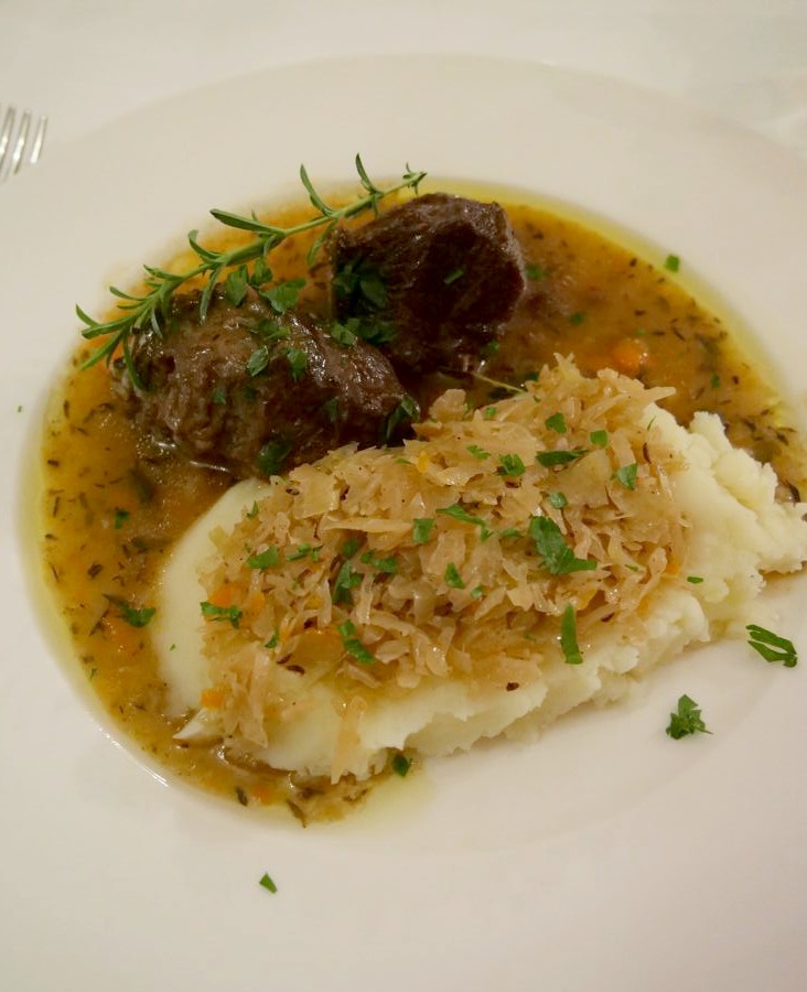 A la carte du restaurant, une cuisine polonaise, cette fois-ci on ne peut plus traditionnelle. C’est l’endroit parfait pour découvrir quelques unes des spécialités locales, comme le Zurek, un bortsch blanc à base de farine de seigle fermentée, traditionnellement servi à Noël. De nombreux plats sont influencés par leurs voisins, comme les cepelinai, les dumplings lituaniens, ou encore le poulet à la Kiev venu d’Ukraine.