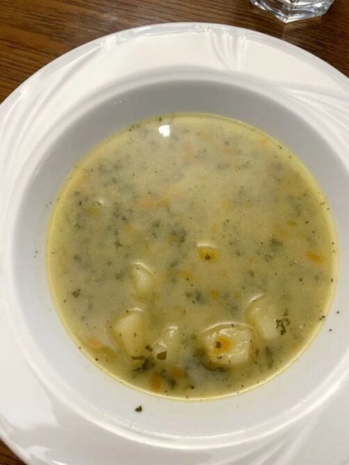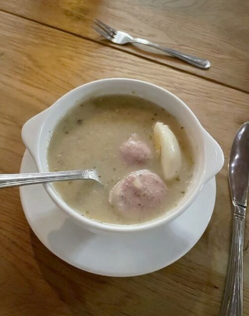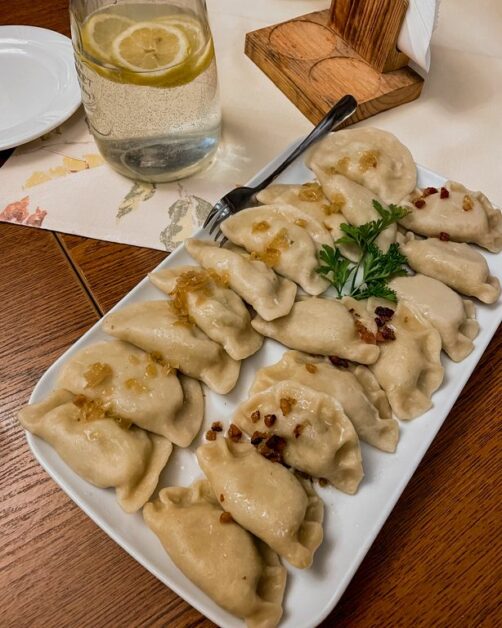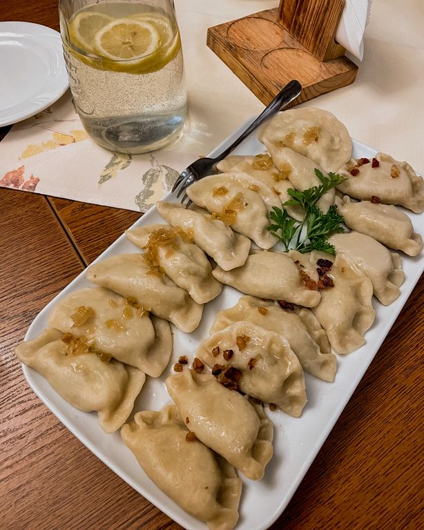 Pour terminer notre visite, nous avons mangé à leur restaurant un repas typique de la région avec une soupe aux orties et de la viande accompagnée de « Babka ziemniaczana », un accompagnement traditionnel à base de pomme de terre. Et ici, on sert les pierogis après le plat principal comme si on servait du fromage ! Bref, mieux vaut garder de la place car tout ça est très bon mais aussi très copieux.