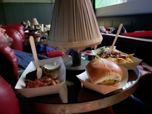 Ce que j’adore dans ce type de cinémas, c’est que l’on peut manger et boire quasiment comme au resto, depuis son fauteuil, en regardant le film ! Les commandes sont encore mieux gérées dans ce cinéma puisqu’on commande en arrivant et on est servi à sa place au début du film. Vraiment top ! Toutes les petites choses à la carte étaient très bonnes, et il y a tout un choix d’alcools (et de softs) à déguster pendant le film.