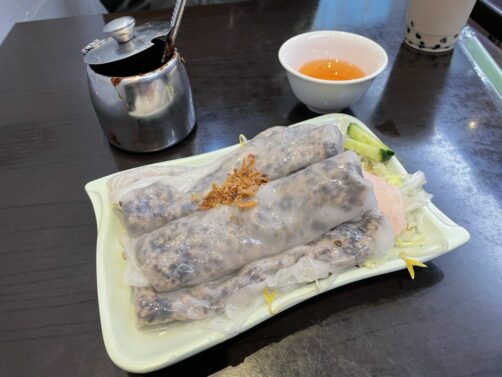 Nous sommes tombés par hasard sur ce « boui boui » vietnamien : il m’a suffit de voir « banh cuon » (crèpes vietnamiennes salées) en vitrine pour nous décider à tester cet endroit qui a l’air très populaire auprès des locaux.