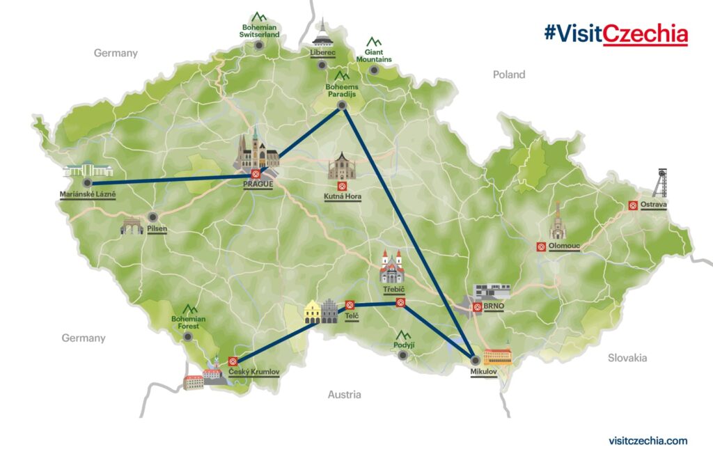 La République tchèque est composée de trois provinces : La Bohême, la Moravie et la Silésie. La Bohême est la partie occidentale de la République tchèque, tandis que la Moravie et la Silésie sont situées à l’est du pays. Chaque région a son propre caractère et c’est pourquoi un voyage en voiture est fortement recommandé.