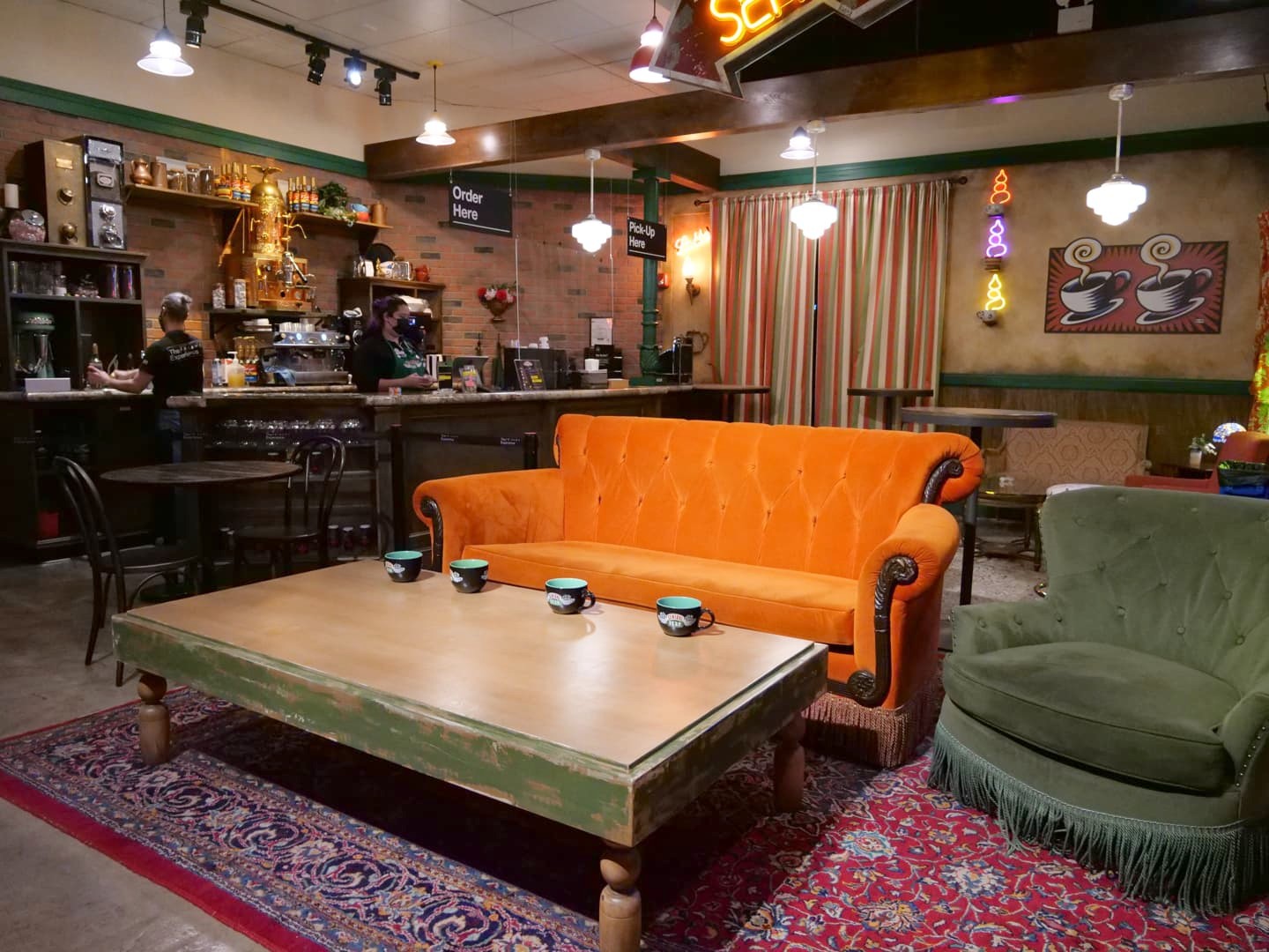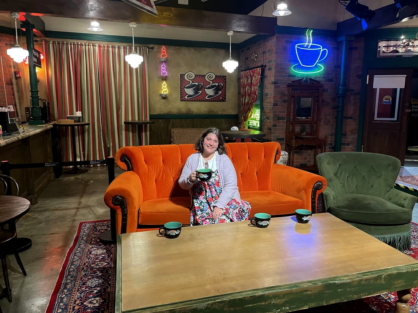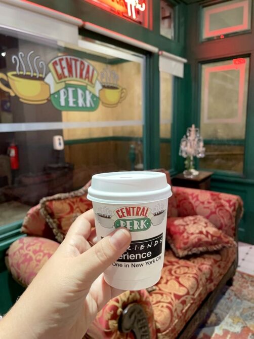 La dernière particularité de cette exposition est que vous pouvez boire un verre et être servi directement dans le Central Perk ! On ne peut pas s’installer dans « le » fauteuil (qui est réservé aux photos), mais on peut s’installer sur d’autres fauteuils ou chaises, et commander au bar ! Dommage, lorsque j’y ai été, ils n’avaient plus en stock de quoi manger, alors je me suis contentée d’un café. Juste pour l’expérience de le boire dans ce cadre si insolite, ça valait le coup !