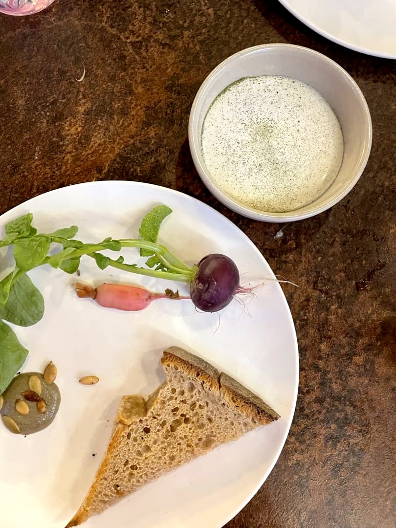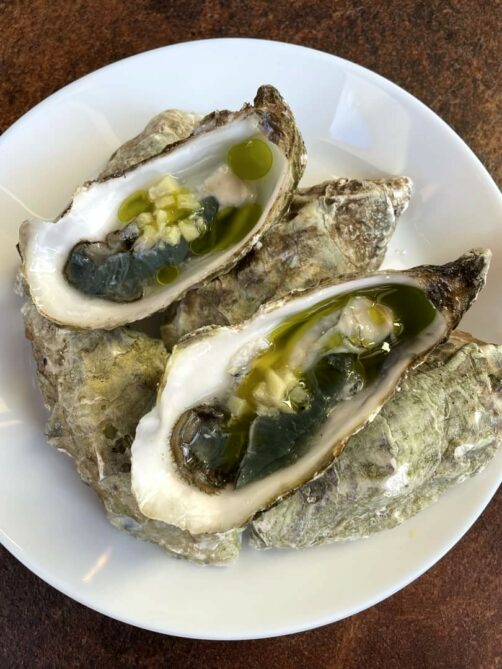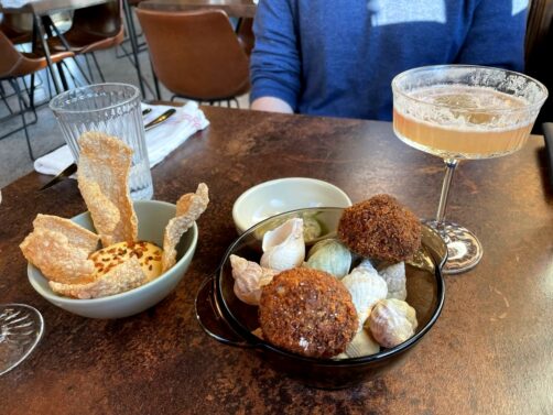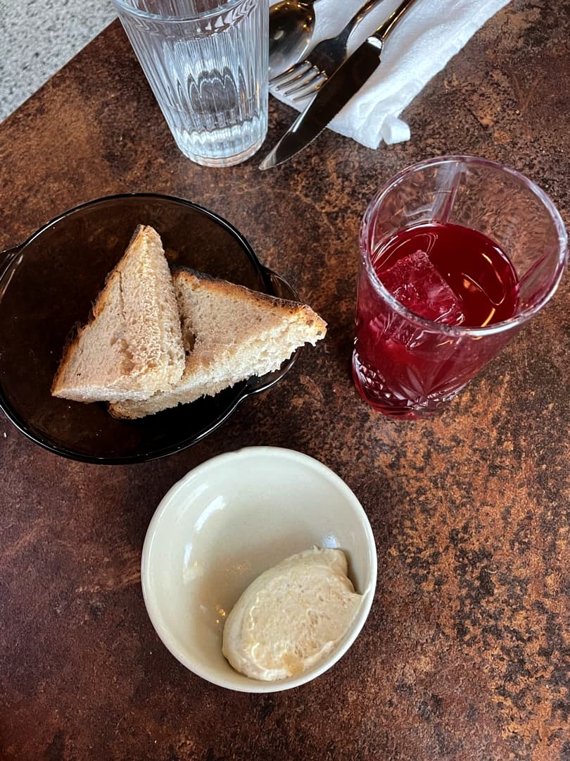 Ce jour-là, on a commencé le menu avec une série de petits plats tous excellents : des croquettes de bulots avec une sauce gribiche, espuma de mimolette et des huîtres, simples mais parfaitement préparées. Et pour accompagner le tout, du pain au levain accompagné d’un dinguissime beurre au poulet rôti !