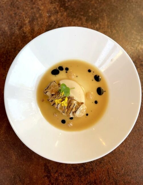 Le service suivant est plutôt original : céleri-rave cuit au foin, avec une purée de céleri fermentée et une sauce au beurre blanc à la bière et au foin.