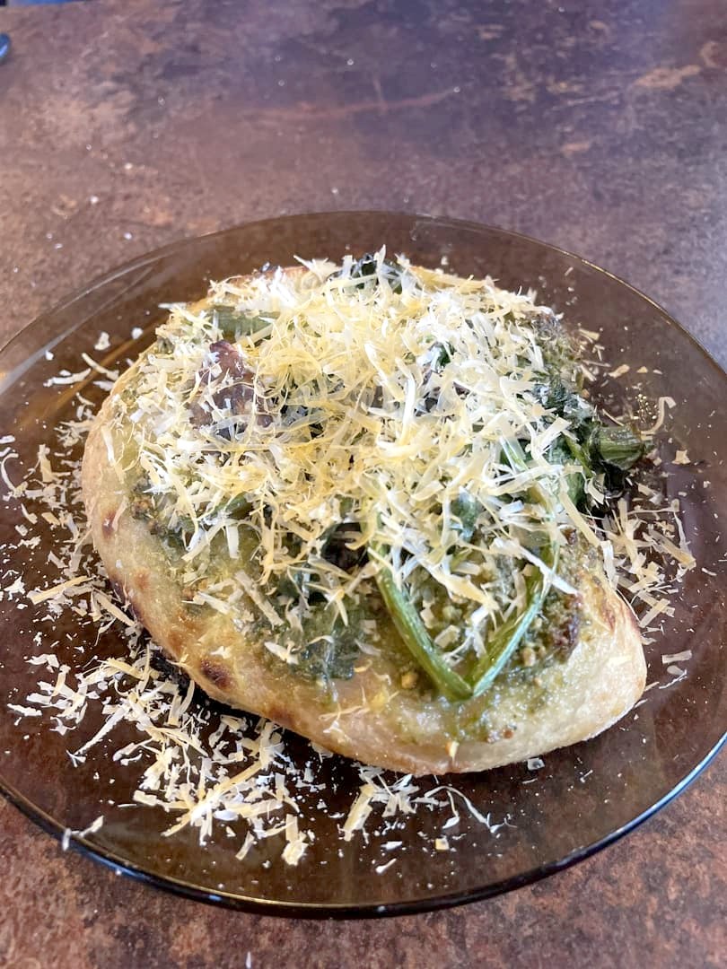 On a poursuivi avec une flamiche au pesto d’ail des ours, épinard, champignon et mimollette. On retrouve ici un des grands classiques de la cuisine populaire du Nord, qui est au centre de la carte de son Bierbuik à Lille : les flamiches. Si j’avais adoré celle que j’avais mangée à Lille, celle-ci a fait un peu flop : en plus d’être bien lourd en fin de repas (ça aurait été mieux de l’avoir juste après les mises en bouche, je trouve), je l’ai trouvée assez fade en goût.