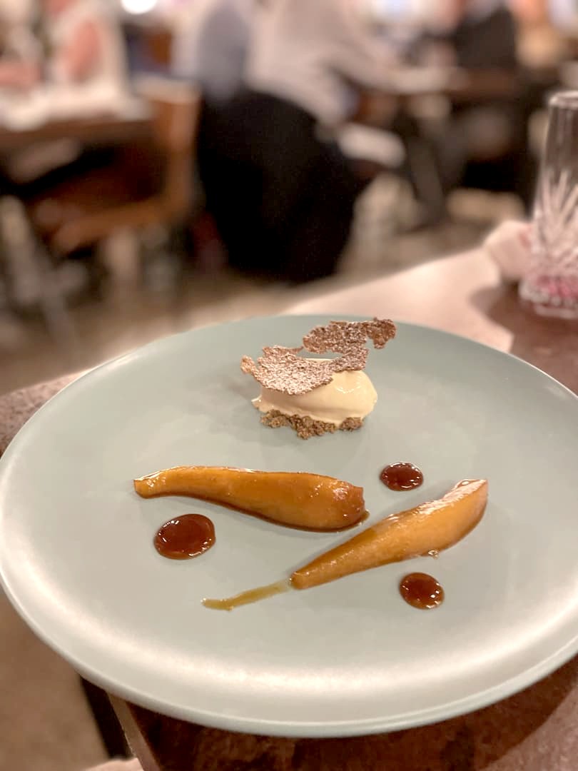 Enfin, après un petit plat de fromage (on est français ou on ne l’est pas), nous avons terminé par un dessert très léger, à base de poire, miso, glace et tuile au sarrasin.