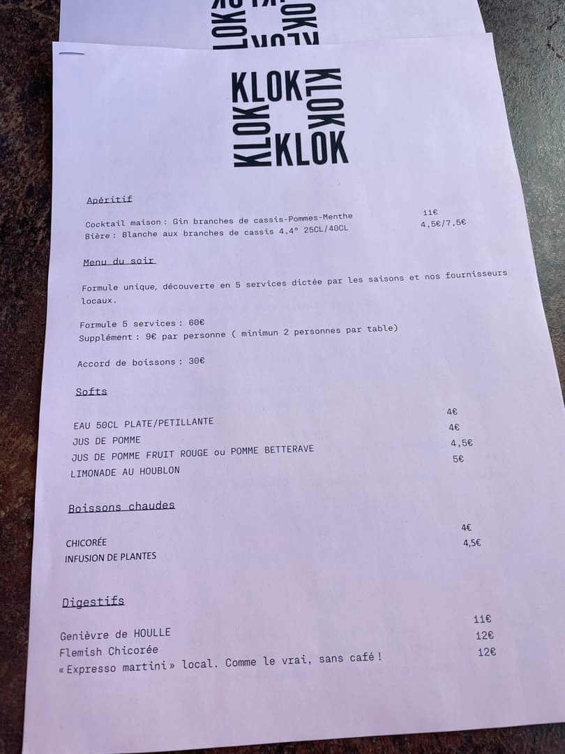 Même si chaque restaurant du chef est différent (avec une gamme allant de la street food au gastronomique), une chose ne change jamais : une carte centrée sur des produits locaux, de saison et avec des préparations originales mais qui vont aussi à l’essentiel. Et même si on a traversé la frontière, Klok garde l’identité d’une cuisine du terroir flamand, en mêlant produits du nord de la France et produits belges : poissons et crustacés de la Mer du Nord côtoient les légumes du bien connu maraîcher flamand Dries Delanote.