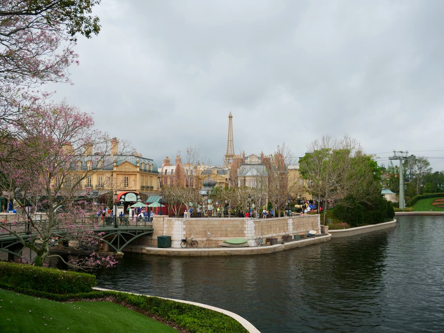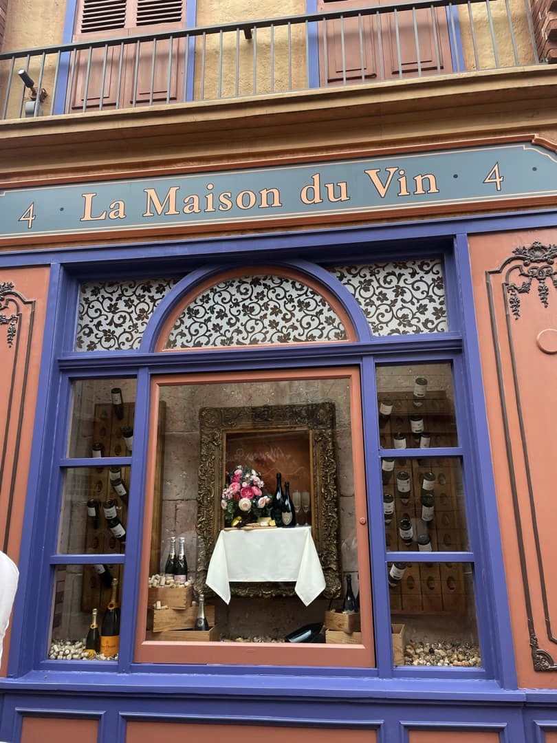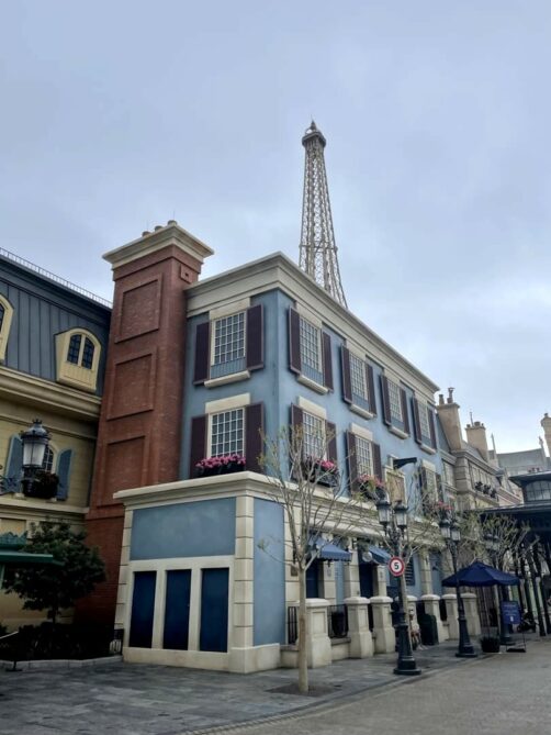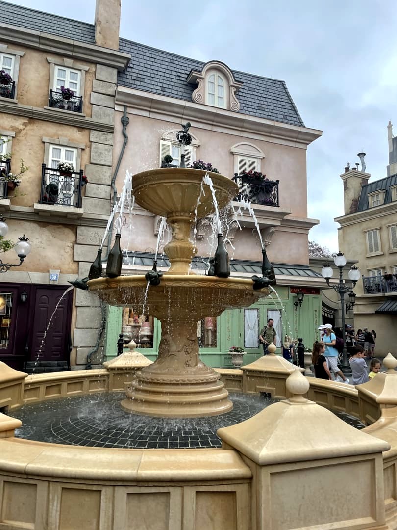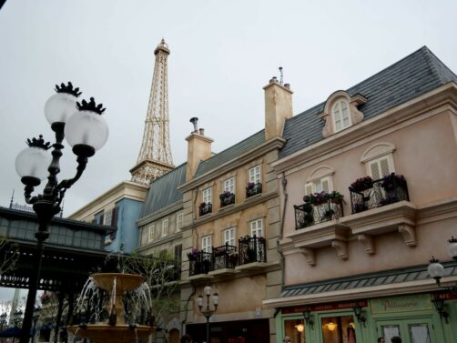 Les décors du pavillon français sont plutôt réussis et offrent une vision idéalisée des rues de Paris, avec la Tour Eiffel, les bouquinistes de la Seine, une boulangerie, un bistro parisien… On peut aussi y croiser des personnages tels que la Belle et la Bête, Gaston, le Bossu de Notre-Dame,…