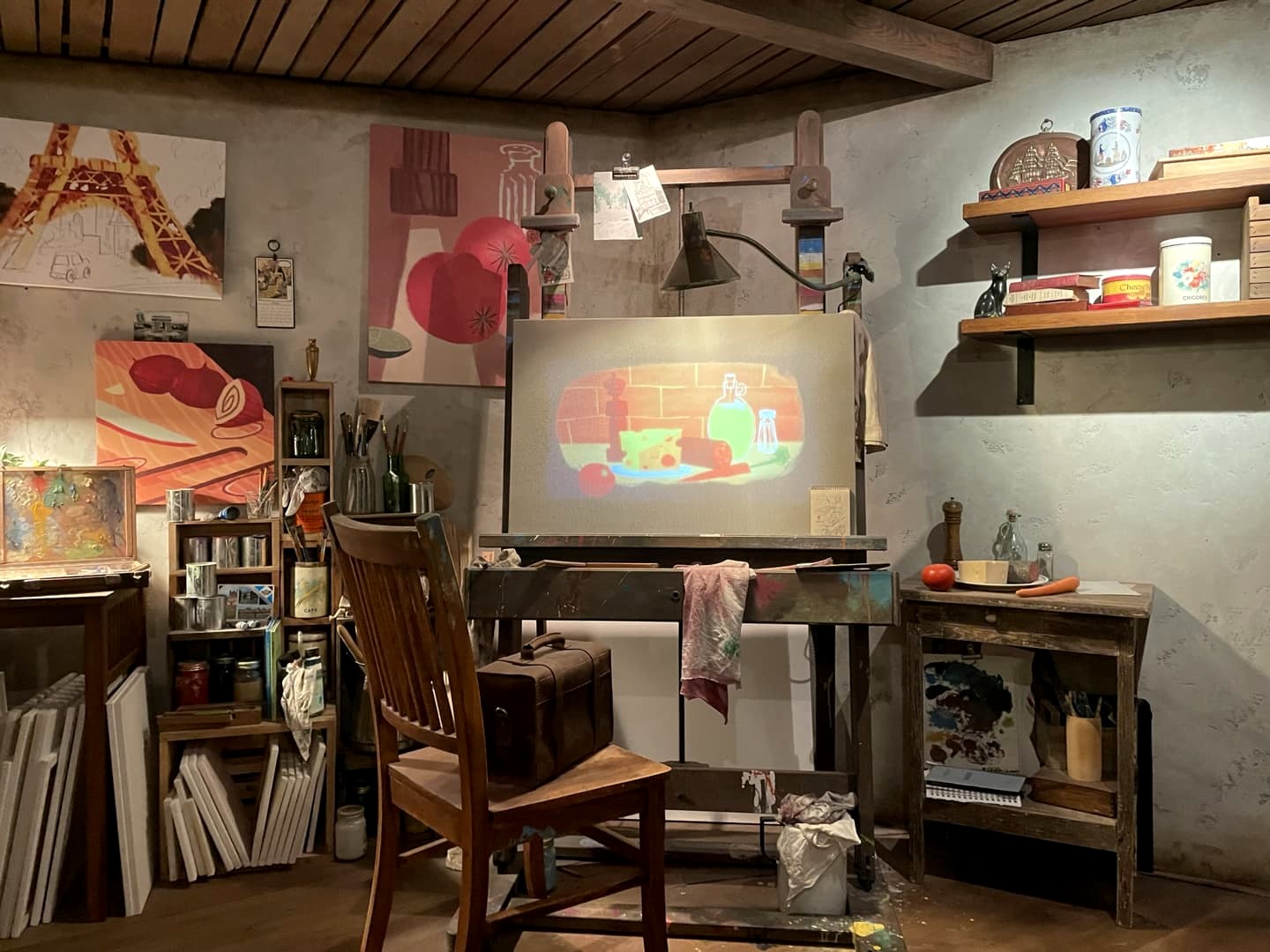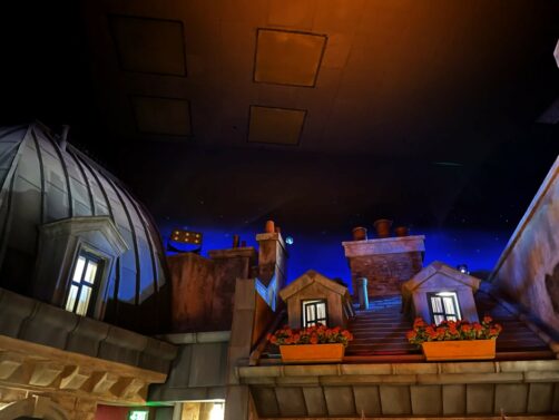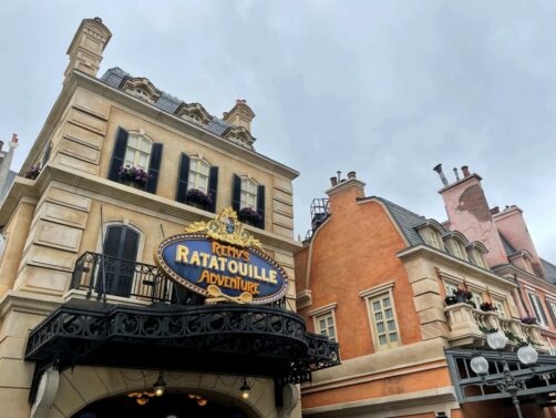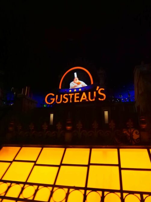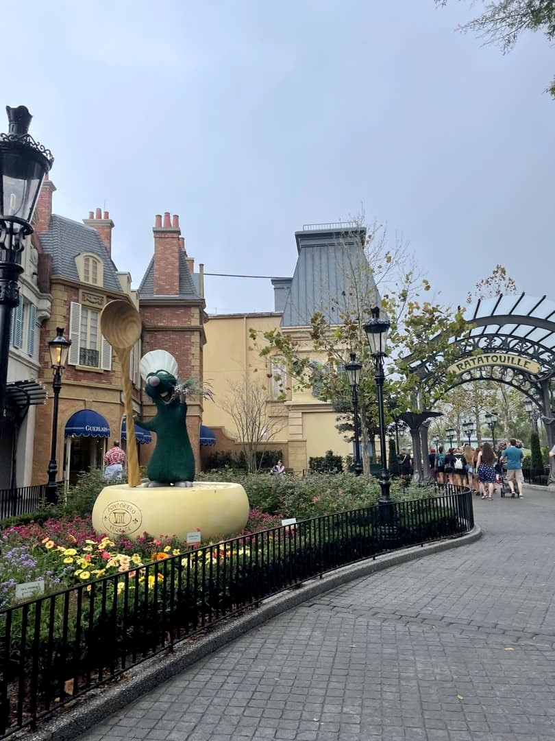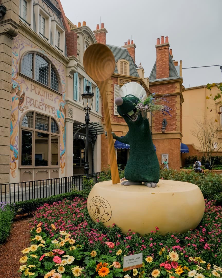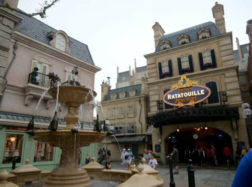 Lors de notre premier tour du « World Showcase », nous avons rapidement passé le Canada et le Royaume-Uni pour arriver dans le pavillon de la France, soit le pays de La Belle et la Bête et de Ratatouille dans l’univers Disney ! Le but de la manoeuvre : faire l’attraction Ratatouille, une des plus populaires et plus récentes du parc (une copie de celle de Disneyland Paris), qui avait vu de très longues files d’attente les jours précédents notre visite. Ca en valait la peine, car on a réussi à la faire en moins de 30 minutes. Et hop, déjà plusieurs heures d’économisées ! L’attraction est très immersive (déjà même dans la file d’attente), on comprend son succès. Et soit dit en passant, la boutique Ratatouille me donnait envie de tout acheter (mais les oreilles Ratatouille à 39 USD… gloups !).