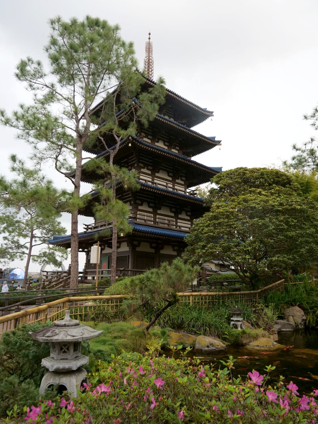 Un peu plus loin, le torii sur l’eau marque l’entrée du pavillon japonais, dominé par une pagode inspirée du temple Horyuji de Nara. Derrière celui-ci, on peut se balader dans des petits jardins japonais.