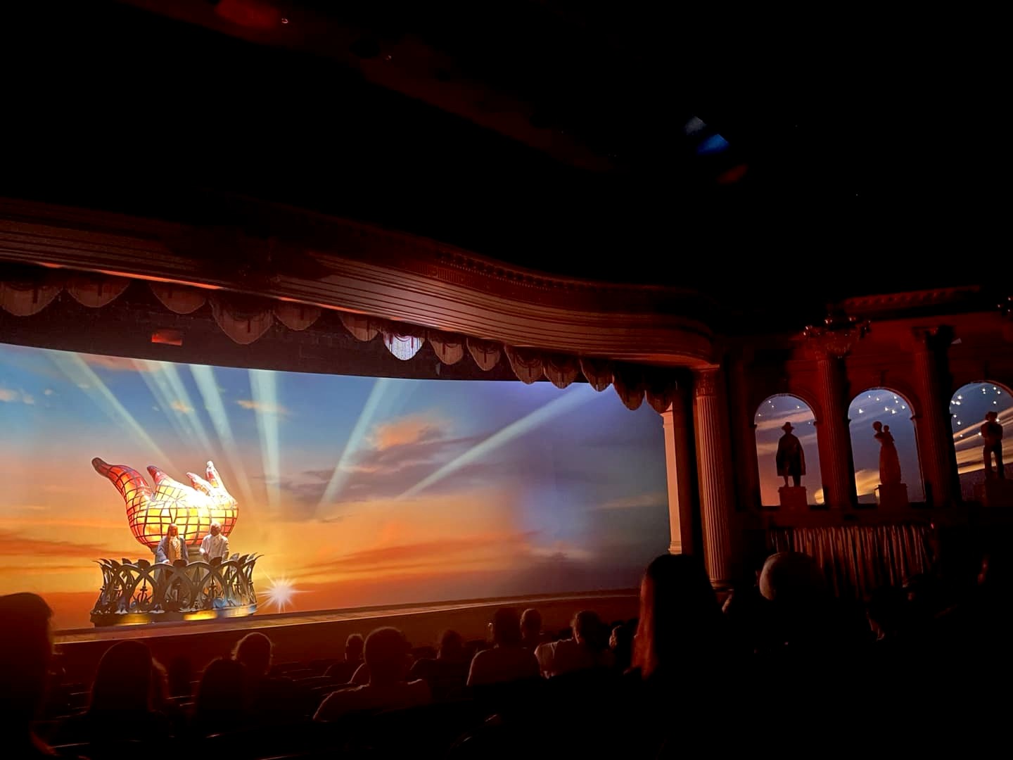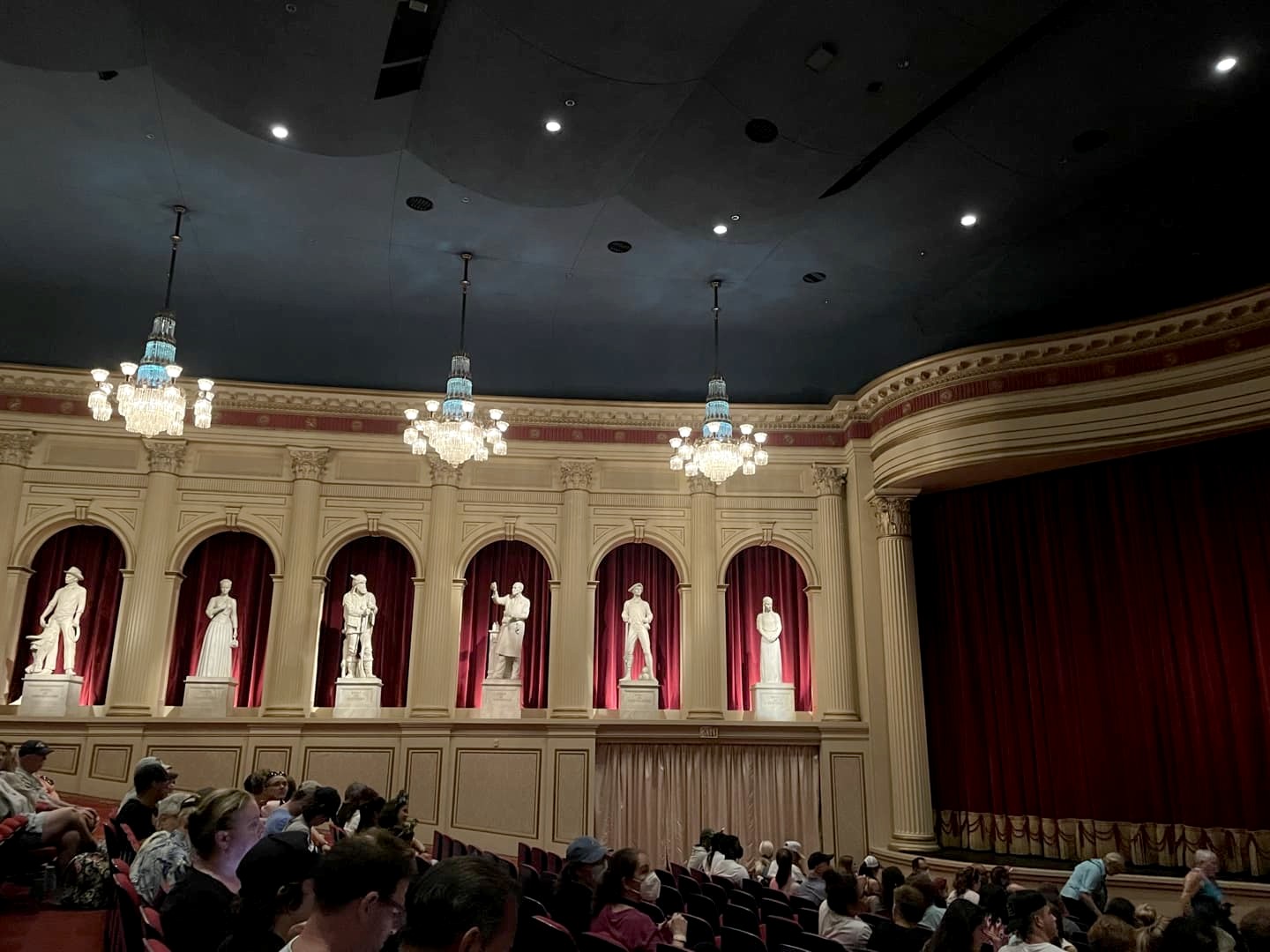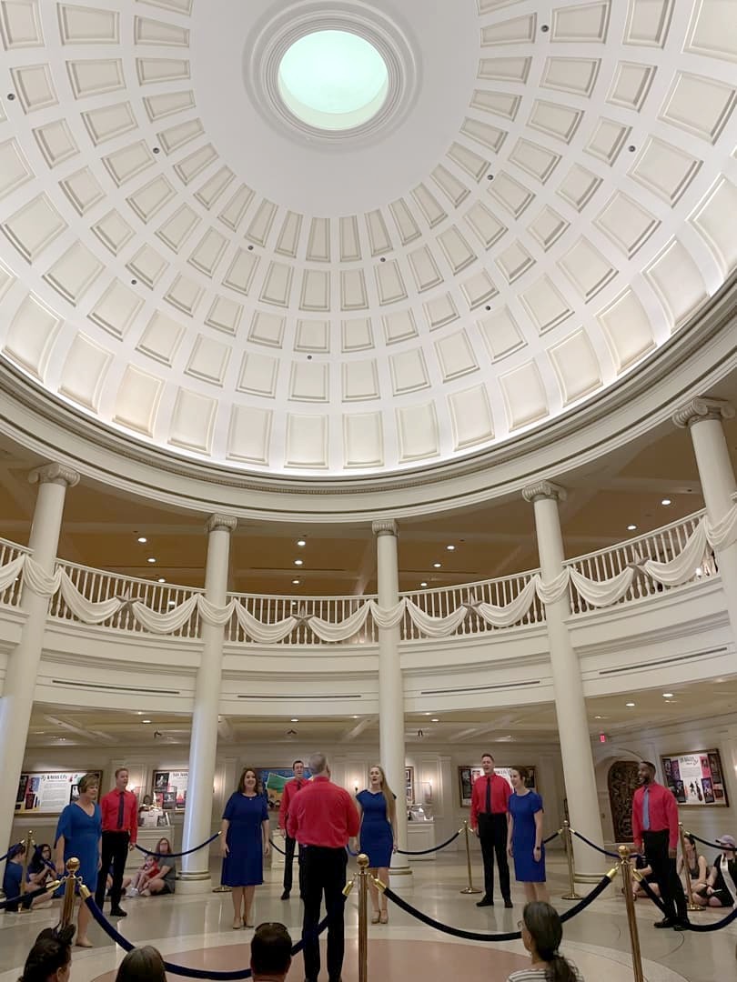On commence par une partie musée (American Heritage Gallery), puis par des chants à cappella (par le groupe « The Voices of Liberty ») et un hymne national qui met tout de suite dans l’ambiance, puis on continue dans un théâtre avec un spectacle en animatronics sur l’histoire des Etats-Unis narré par Benjamin Franklin et Mark Twain. On avait déjà retrouvé ce côté très Americana dans la zone Liberty Square à Magic Kingdom, mais dans ce pavillon américain on retrouve le patriotisme de Disney à son paroxysme !