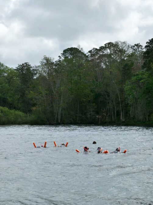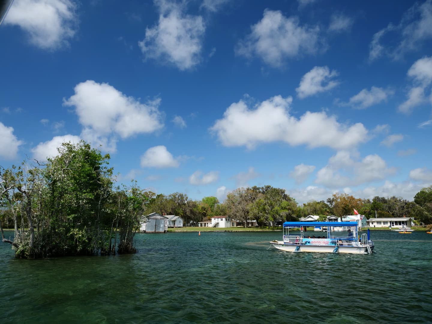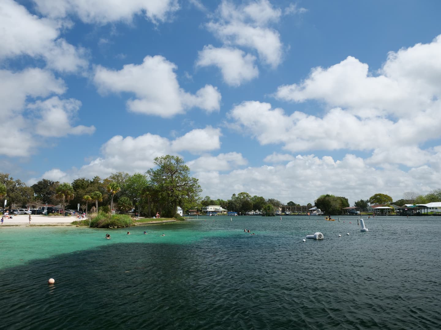 Comme les lamantins étaient ce jour-là très très proches du point de départ du bateau, une fois que notre séance de nage s’est terminée, nous avons fait un petit tour en bateau avant de rentrer. Le bateau nous emmène jusqu’à l’une des sources chaudes de Crystal River : on se remet à l’eau pour essayer de l’observer en snorkeling, mais ce n’est pas si facile à trouver sous l’eau ! Il n’empêche que le spot est splendide, l’eau d’un bleu intense et il y a même une sorte de petite plage juste à côté. On croise aussi plusieurs kayak sur notre route. On a un vrai sentiment de vacances ici !