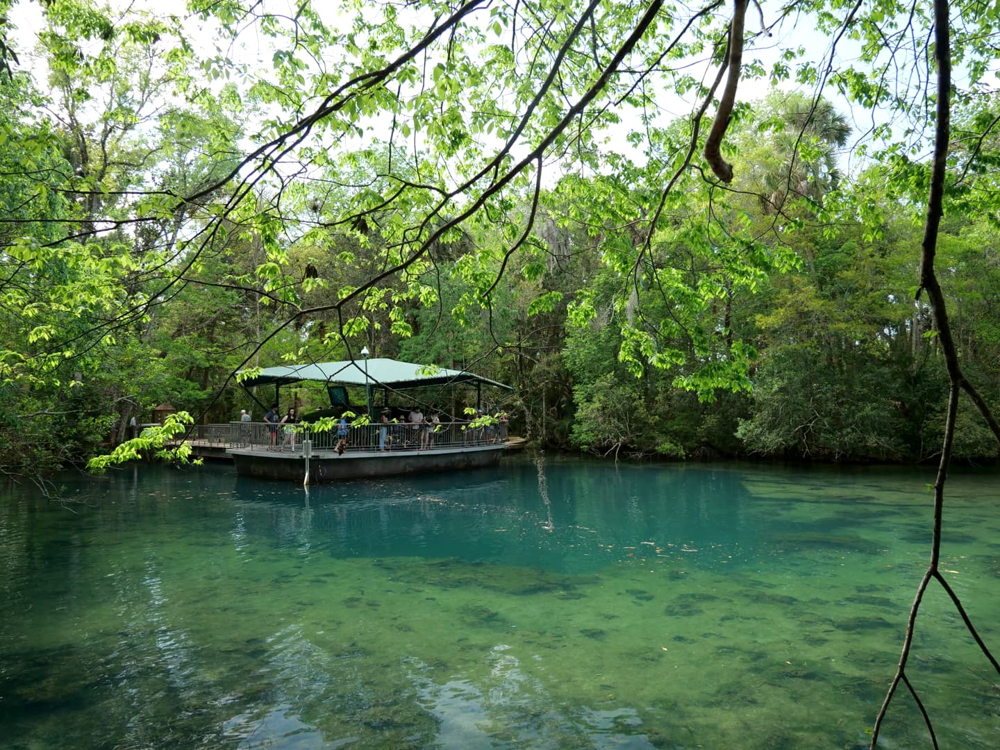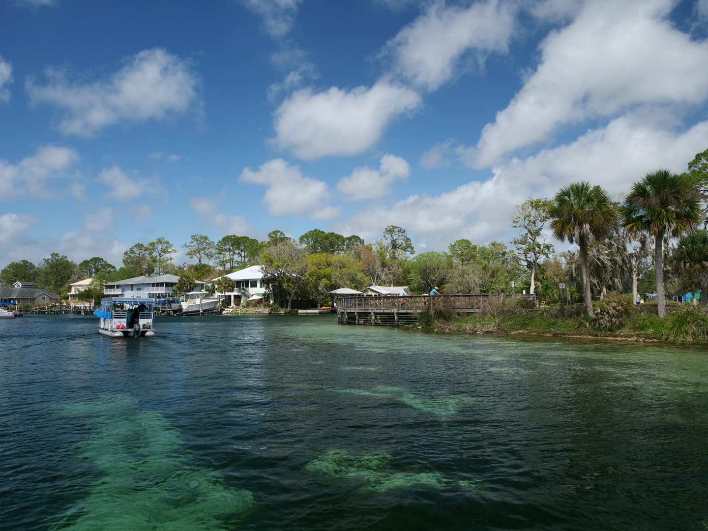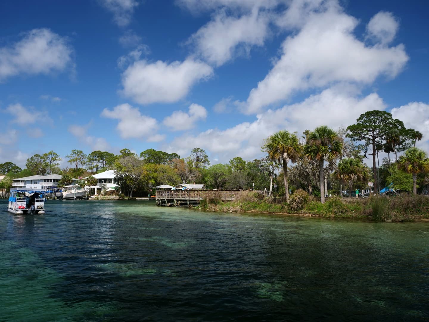 Comme les lamantins étaient ce jour-là très très proches du point de départ du bateau, une fois que notre séance de nage s’est terminée, nous avons fait un petit tour en bateau avant de rentrer. Le bateau nous emmène jusqu’à l’une des sources chaudes de Crystal River : on se remet à l’eau pour essayer de l’observer en snorkeling, mais ce n’est pas si facile à trouver sous l’eau ! Il n’empêche que le spot est splendide, l’eau d’un bleu intense et il y a même une sorte de petite plage juste à côté. On croise aussi plusieurs kayak sur notre route. On a un vrai sentiment de vacances ici !