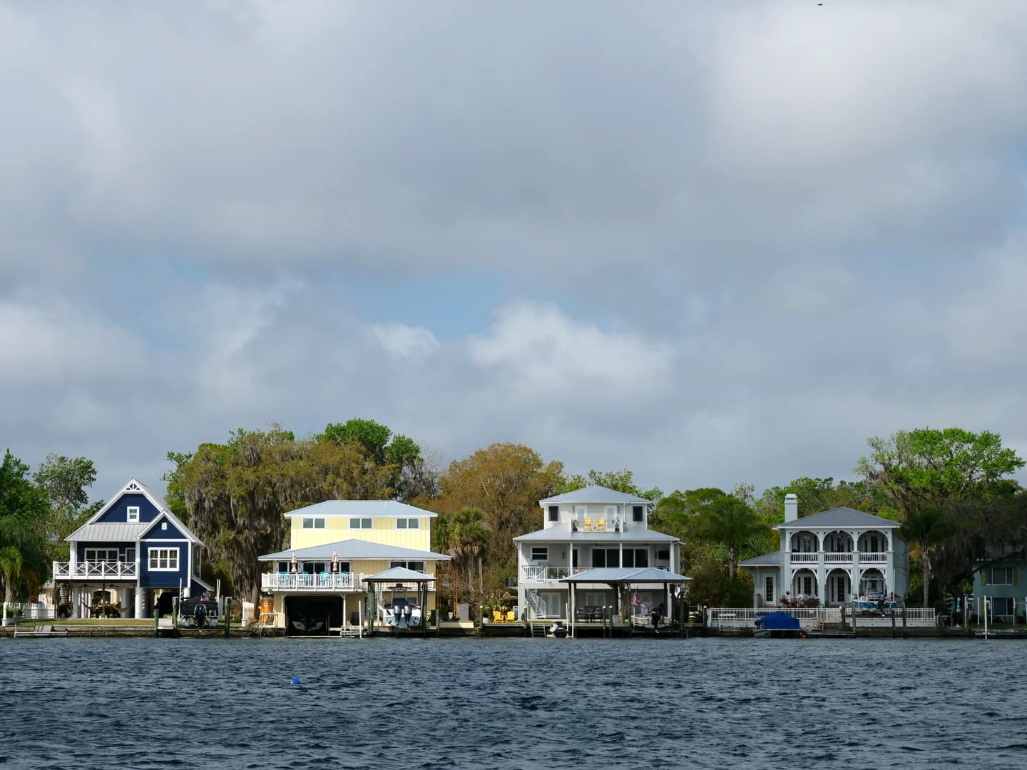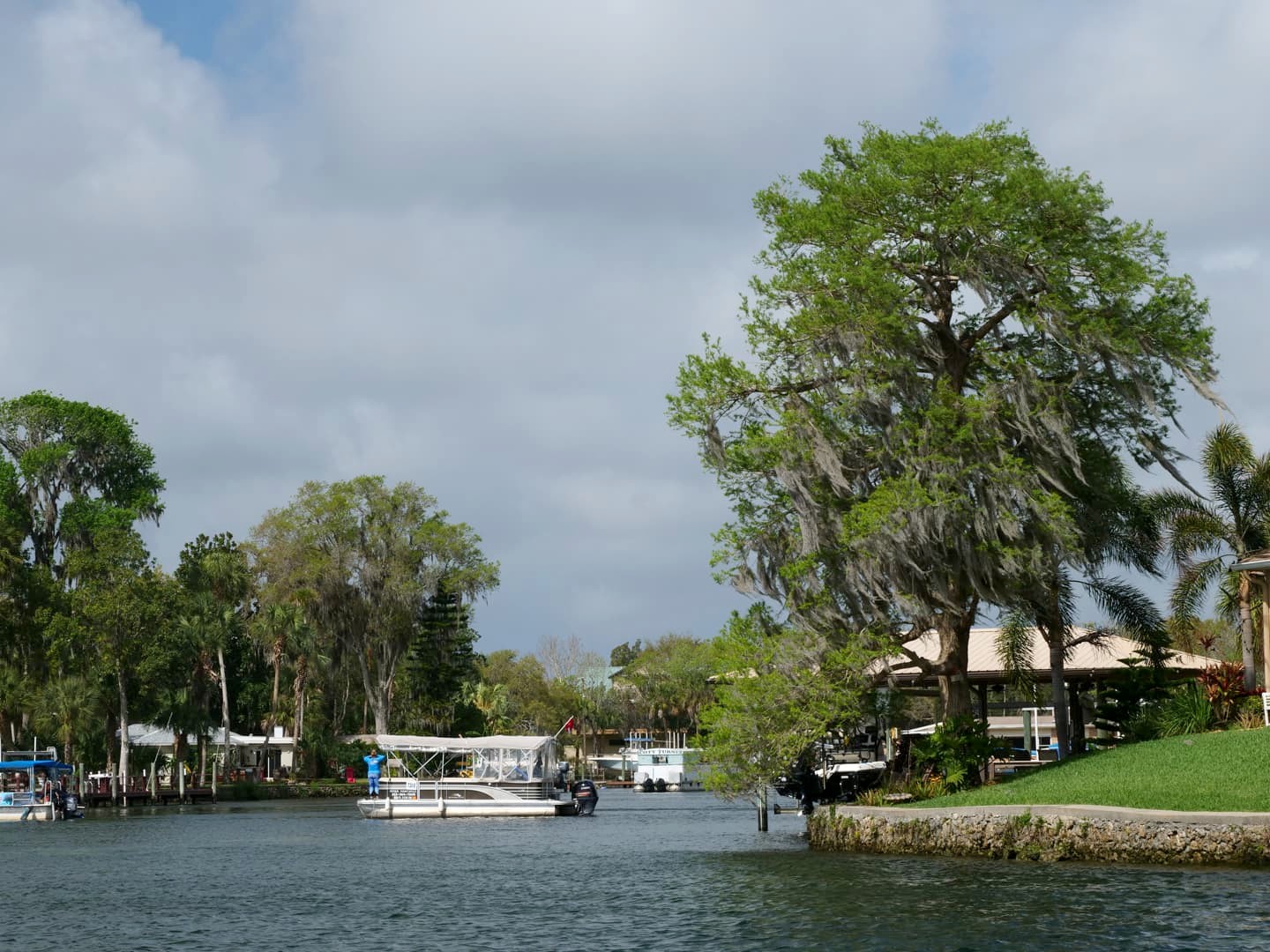 En quelques minutes de marche, nous rejoindrons le petit bateau qui nous emmènera là où se trouve les lamantins. Parfois ils sont tout proches, parfois un peu plus loin, et parfois il faut plus les chercher. Ce jour-là, même si comme je le disais plus haut, une bonne partie a déjà quitté Crystal River pour la saison, un petit groupe de plusieurs lamantins a déjà été repéré ce matin-là, et un premier petit groupe y est déjà. Ils se trouvent à quelques minutes seulement de l’embarcadère, dans une zone où il y a encore des maisons : le vrai tour en bateau, ça sera donc pour après !