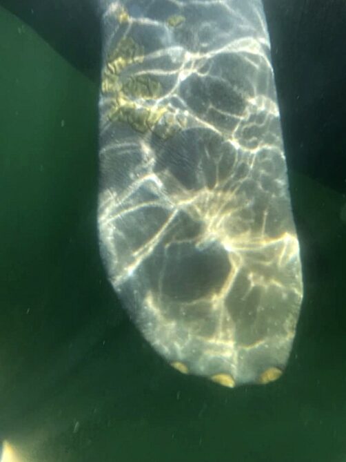 Ceci dit, comme on l’a vite remarqué, les lamantins sont de nature très curieuse, alors même en tentant de ne pas s’en approcher, certaines règles peuvent vite se révéler assez difficiles à respecter quand ils « foncent » vers vous. Je n’ai donc pas pu éviter qu’un des lamantins me touche : il est venu se frotter à moi en me tapant sa patte dans l’oeil pendant que je faisait difficilement des mini mouvements des mains pour essayer en vin de m’extirper tout en restant à la surface !