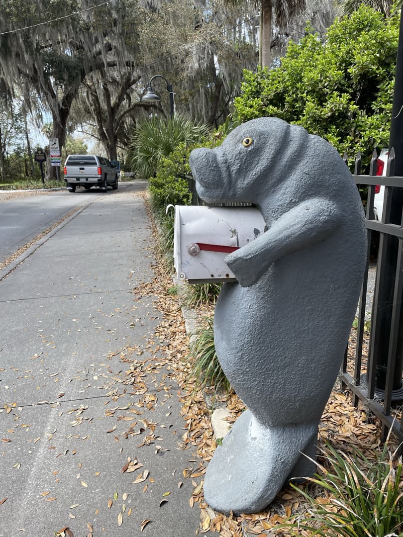 Nous débarquons à Crystal River, où le changement d’ambiance est total par rapport à Orlando et Miami : ça me rappelle plus mon roadtrip dans le « Deep South ». Il faut dire que, techniquement, on y est, puisque Crystal River, Mobile et la Nouvelle-Orléans se trouvent tous les trois dans le Golfe du Mexique. On voit que la ville vit en bonne partie de la présence des lamantins car ils sont partout, jusqu’à la forme des boîtes aux lettres !