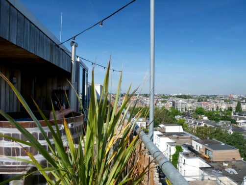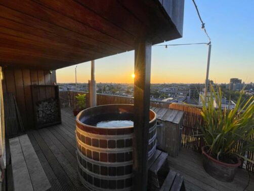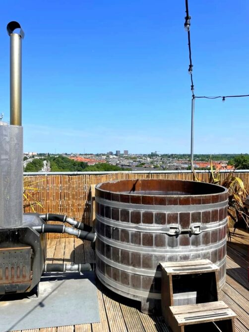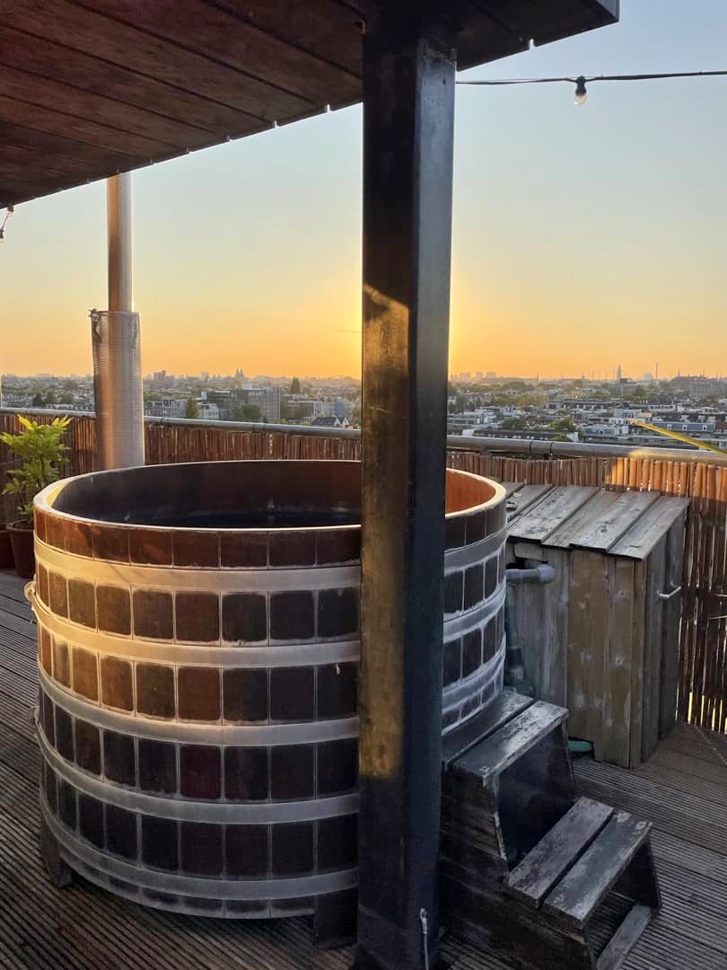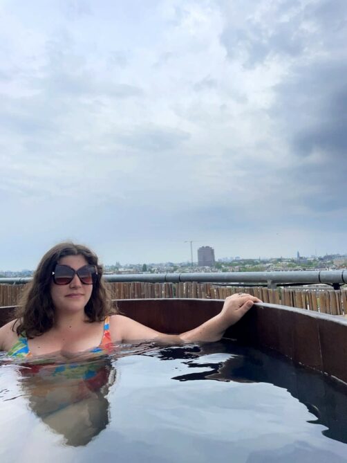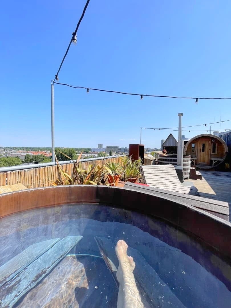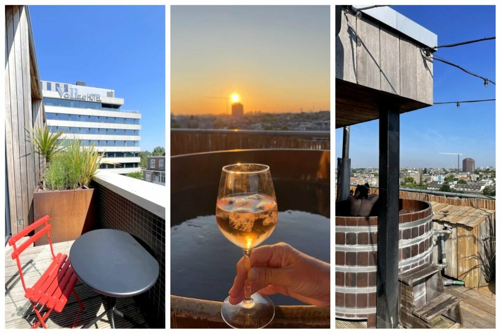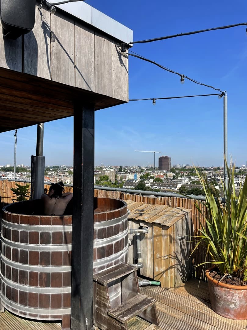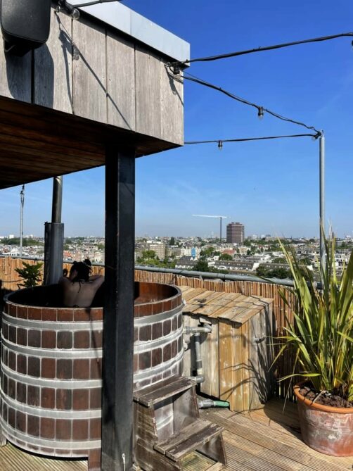 Le Badplaats, ce sont des hot tubs (bains nordiques en bois) et un sauna, situés au 8ème étage de l’hôtel et offrant des vues panoramiques sur Amsterdam ! Ceux-ci sont ouverts toute la journée et, étrangement vu le nombre de chambres de l’hôtel, il n’y avait quasiment jamais personne (car oui, évidemment, j’en ai bien profité chaque jour de mon séjour – vous me connaissez !).