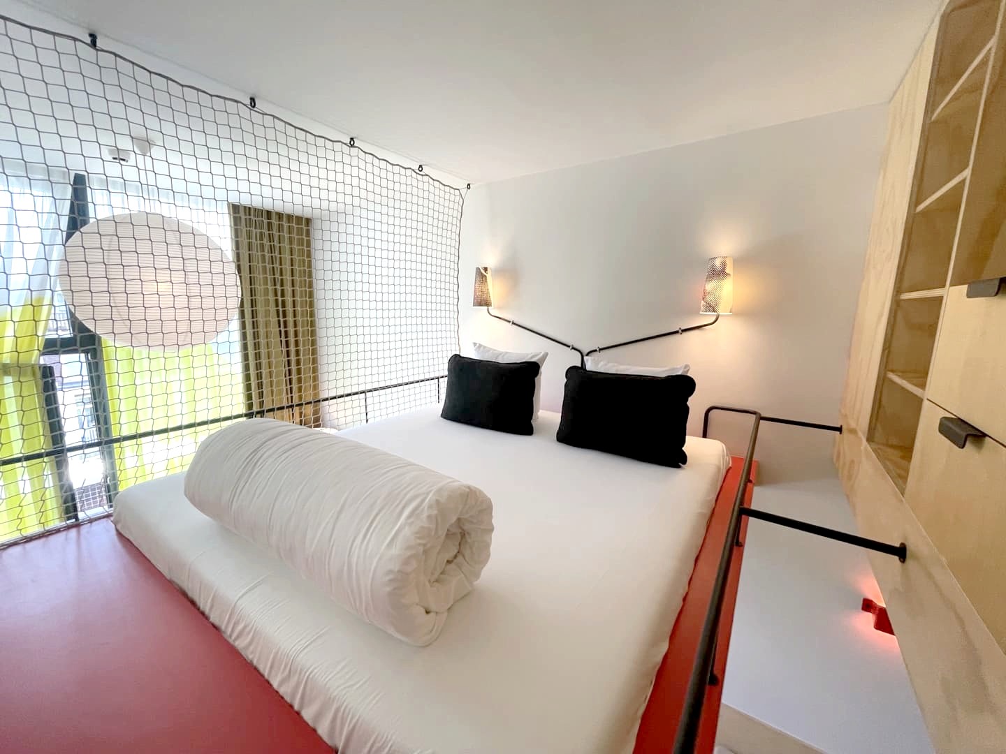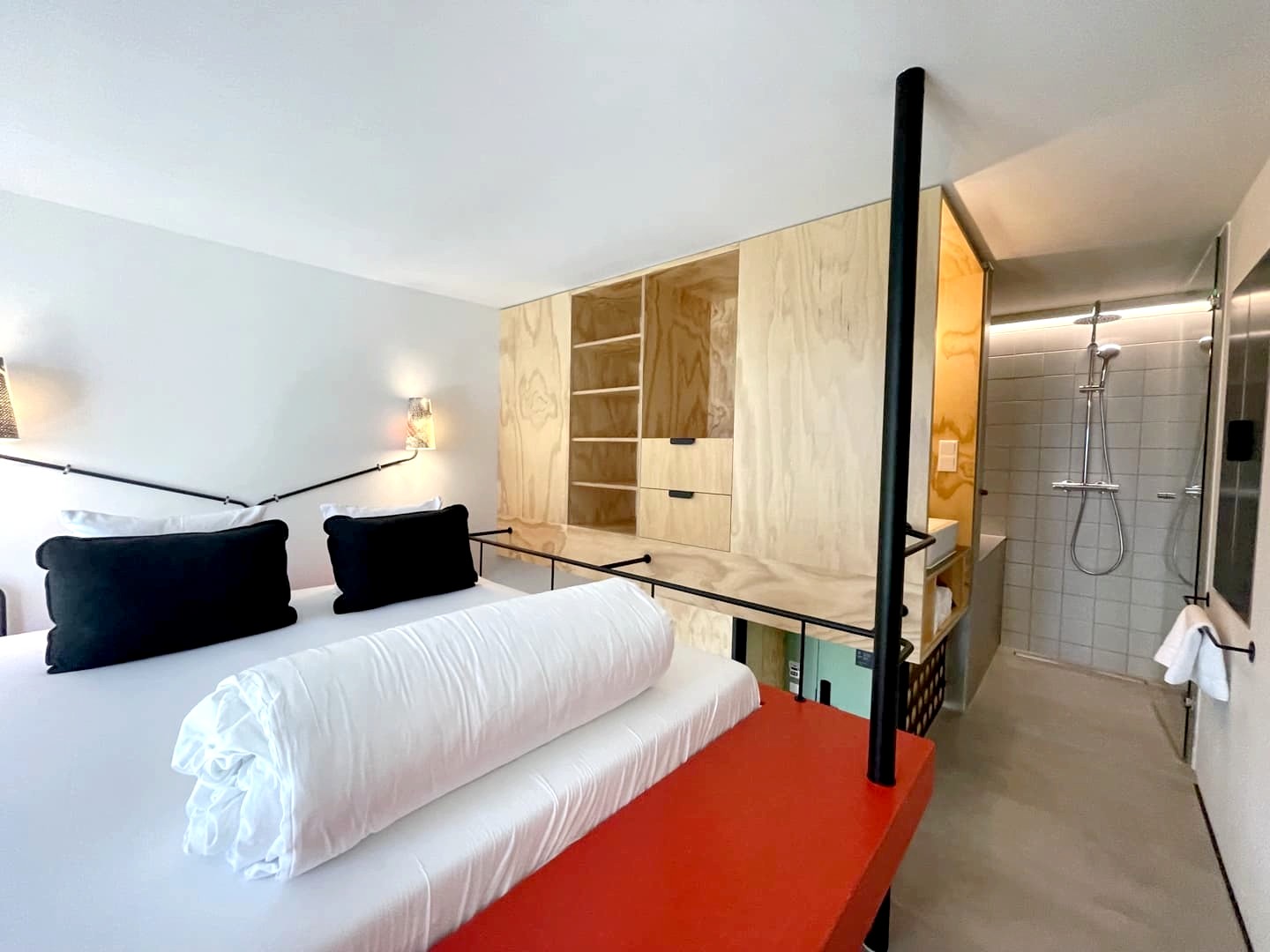 Et les chambres dans tout ça ? L’autre originalité et grand atout du Volkshotel est qu’il propose des chambres pour tous les budgets, de la cabine à partir de 49€ la nuit (mini chambre individuelle façon capsule hotel) aux chambres décorées par des designers, dont certaines notamment avec de superbes bains avec vue.
