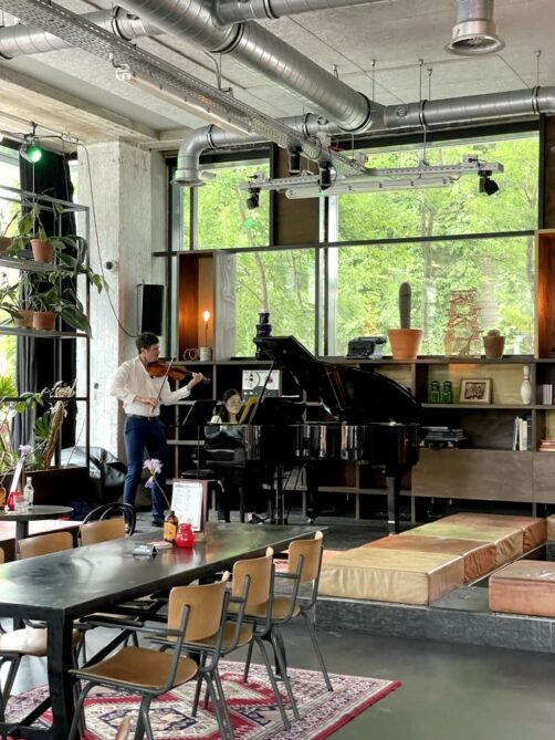 L’endroit était ensuite devenu un « creative office », offrant des espaces de travail à des professions artistiques et créatives (mode, designer, théâtre, musiciens,…). Et encore aujourd’hui, à côté de ses plus de 200 chambres, le bâtiment accueille encore 85 bureaux créatifs, un espace de co-working et même des studios d’enregistrement dans ses sous-sol (à côté d’un club, le Doka). C’est donc tout naturellement que l’hôtel héberge aussi régulièrement des résidences et expositions d’artistes, ou encore des « Piano Sundays » organisés (entrée gratuite) une fois par mois dans le lobby de l’hôtel (j’ai eu l’occasion d’en voir la fin et l’ambiance était vraiment cool !). Bref, si vous avez la fibre artistique, le Volkshotel est clairement fait pour vous, vous l’aurez compris !