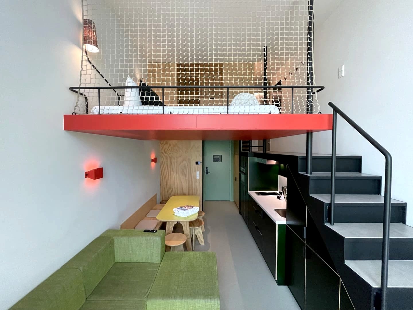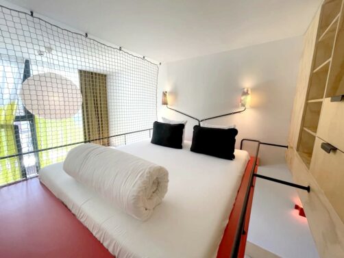 Entre les deux, on trouve aussi des Studios, où il est possible de séjourner jusqu’à 6 mois. C’est dans cette catégorie de chambre que j’ai séjourné. Les studios sont particulièrement bien agencés et tout l’espace est optimisé grâce à une mezzanine. À l’étage du bas, on trouve un grand espace de vin avec cuisine et coin salon, donnant sur une petite terrasse ensoleillée. Et à l’étage se trouve l’espace de nuit avec le lit, des rangements, et la salle de douche. Le lit haut perché est bien sécurisé, mais pourrait déconcerter les personnes sujettes au vertige. Si ce n’est pas votre cas, sachez que le lit est particulièrement confortable ! Et la cerise sur le gâteau pour l’été, c’est la climatisation.