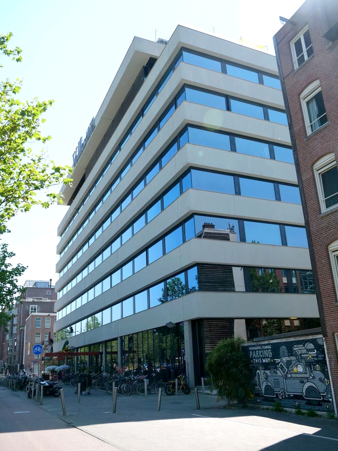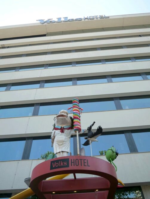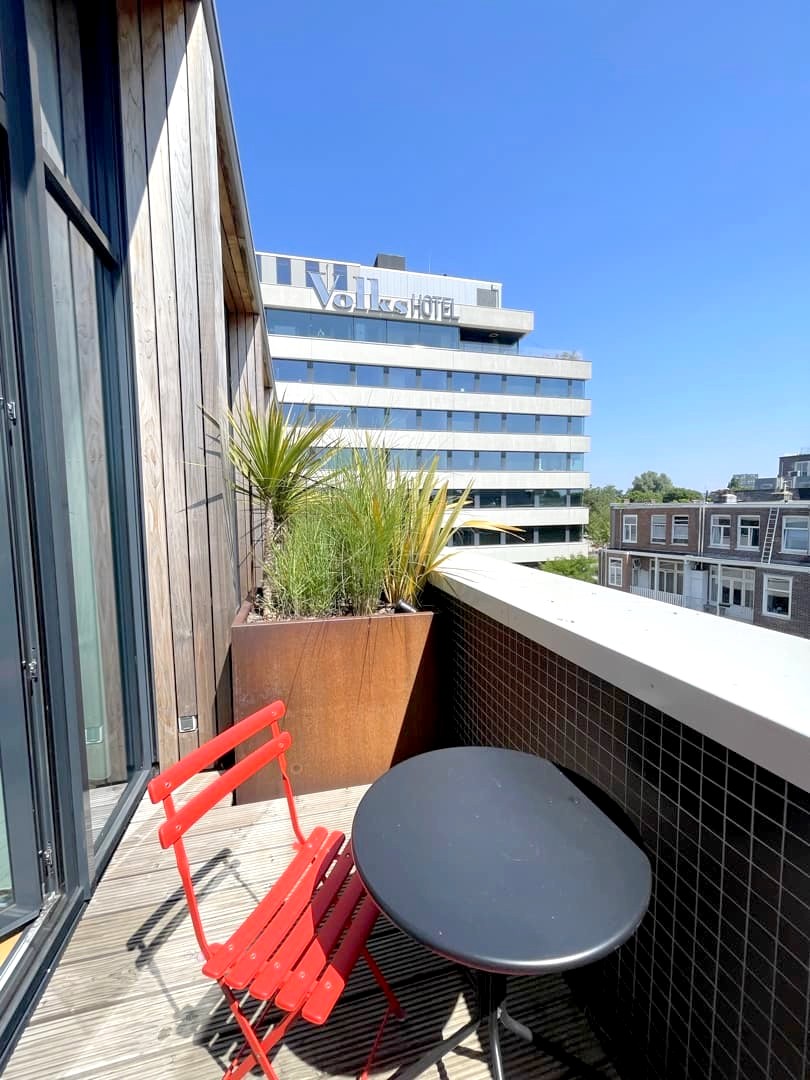 L’histoire du quartier se retrouve pleinement au Volkshotel, puisque ce concept hotel occupe l’ancien bâtiment, datant des années 60, d’un journal néerlandais progressiste, le Volkskrant. C’est de ce journal dont vient donc le nom de l’hôtel (même s’ils n’ont rien à voir avec ce journal), et ils ont même gardé une partie du lettrage d’origine sur leur façade.