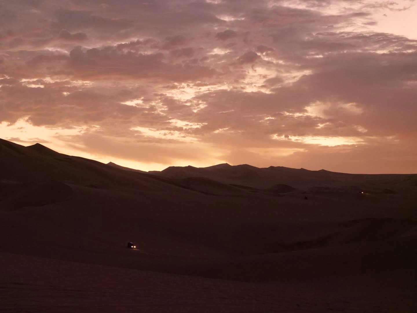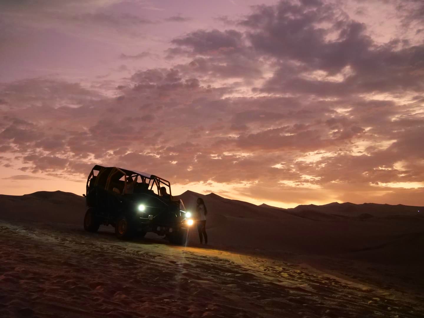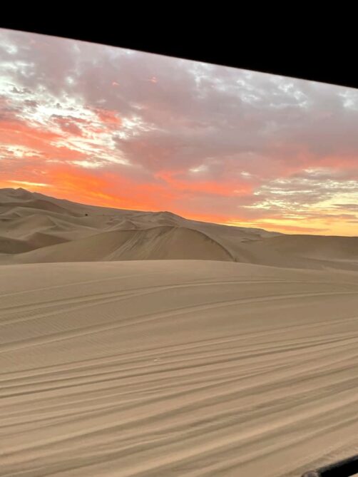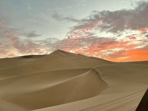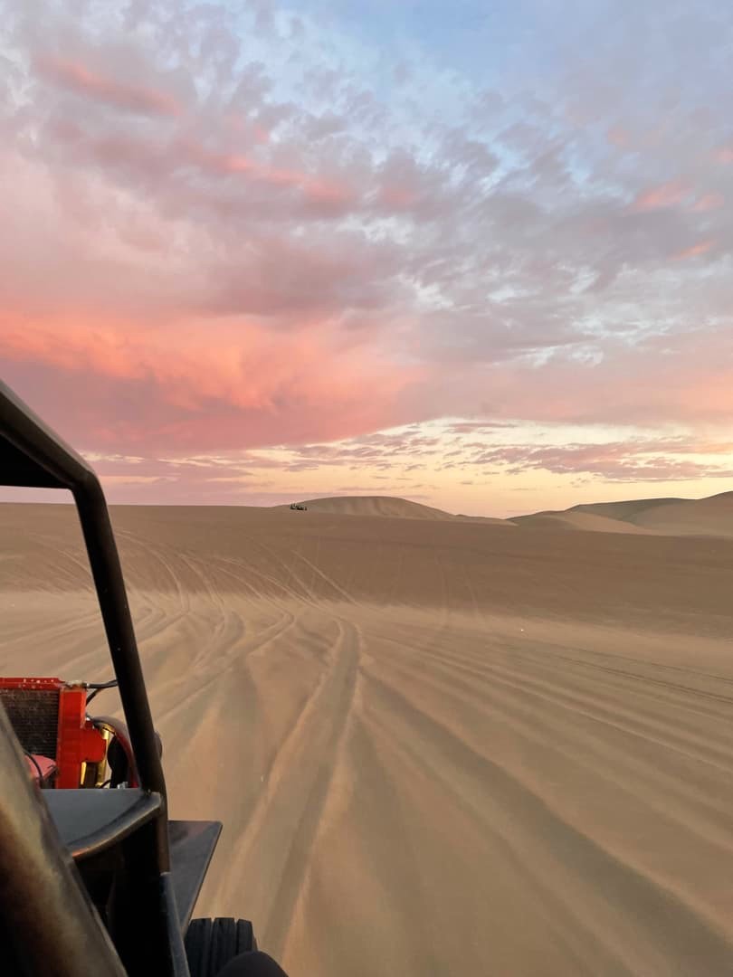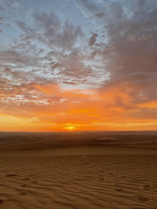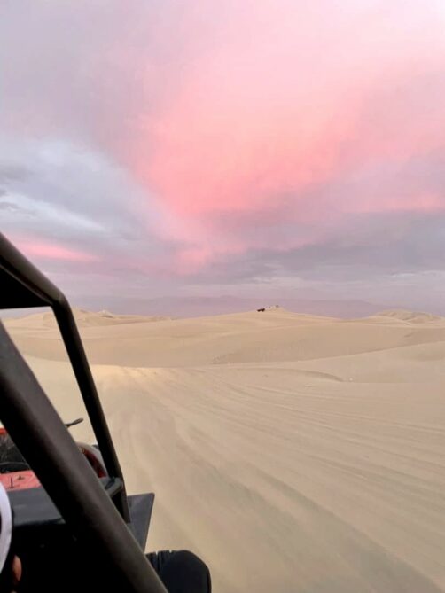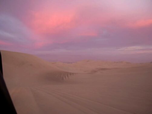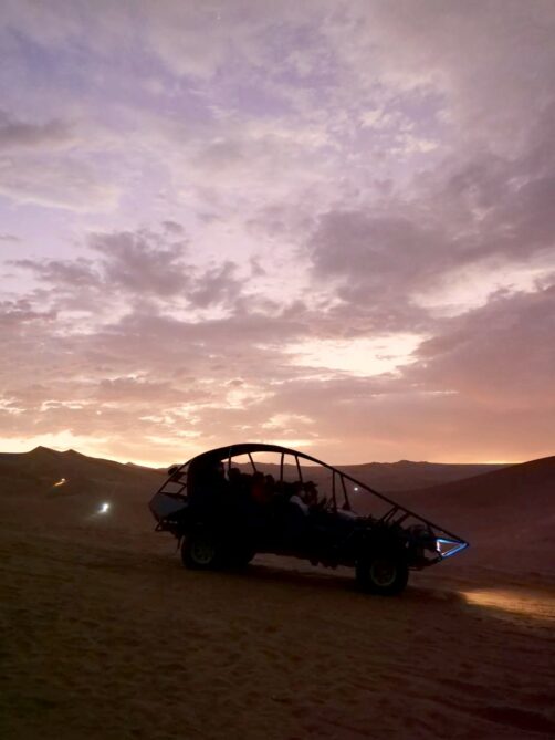 Le ciel s’était un peu couvert en fin de journée, mais on sait tous que ce sont les nuages qui donnent souvent les plus beaux couchers de soleil, et ça n’a pas manqué. Le coucher de soleil auquel on a assisté dans les dunes de Huacachina est probablement dans mon top 10 des plus beaux couchers de soleil que j’ai pu voir de toute ma vie ! Et le trajet de retour vers l’oasis sous un ciel entièrement rose fut tout aussi magique.